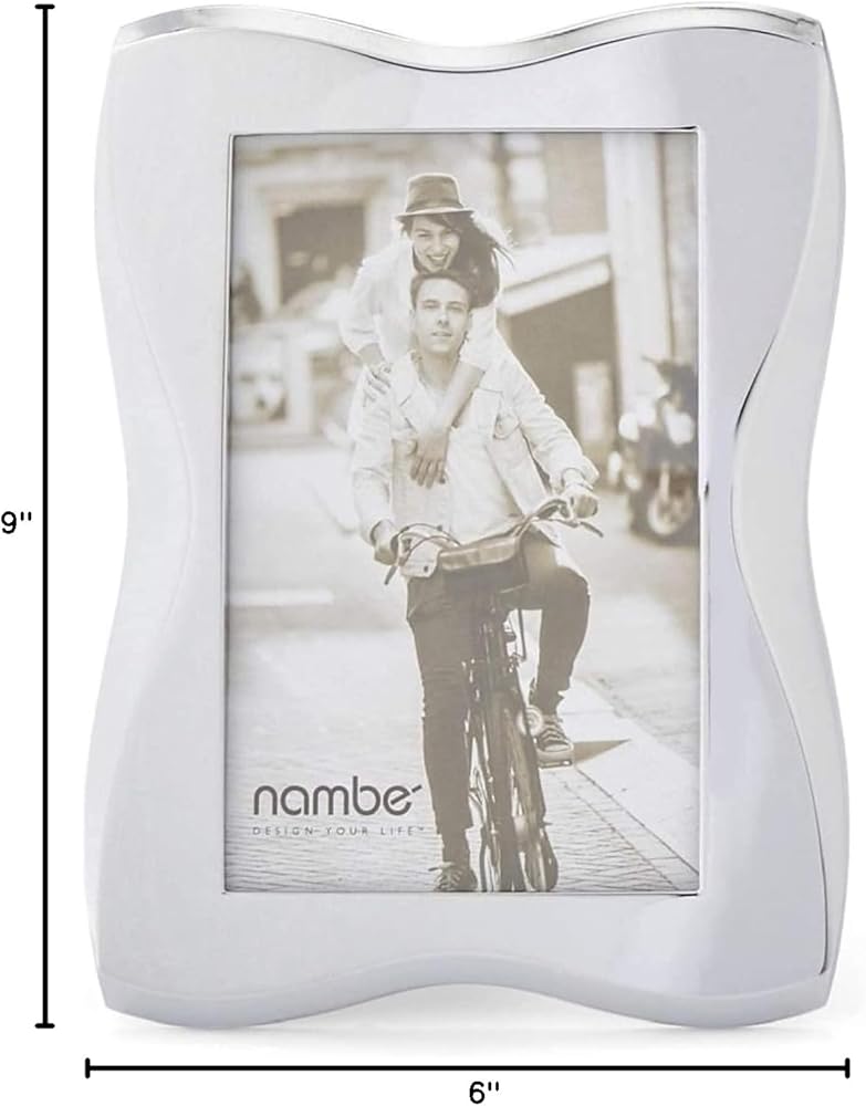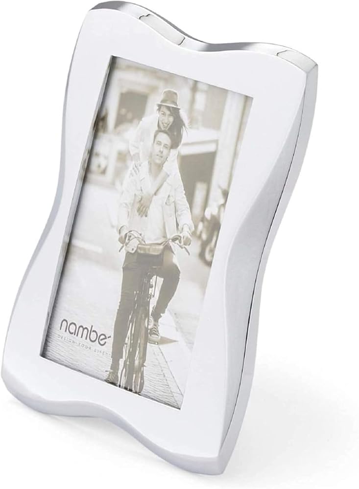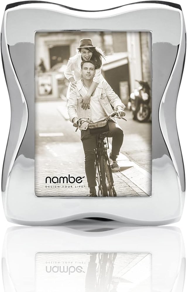 PRODUCT SPECIFICATIONS: Package contains (1) Nambe Bella Picture Frame, 4" x 6". Modern décor style. Made of chrome plate and glass. Holds a single photo, accommodating both vertical and horizontal positioning. To clean, wipe with damp cloth and dry immediately. Designed by Steve Cozzolino in 2013 for the Bella collection.