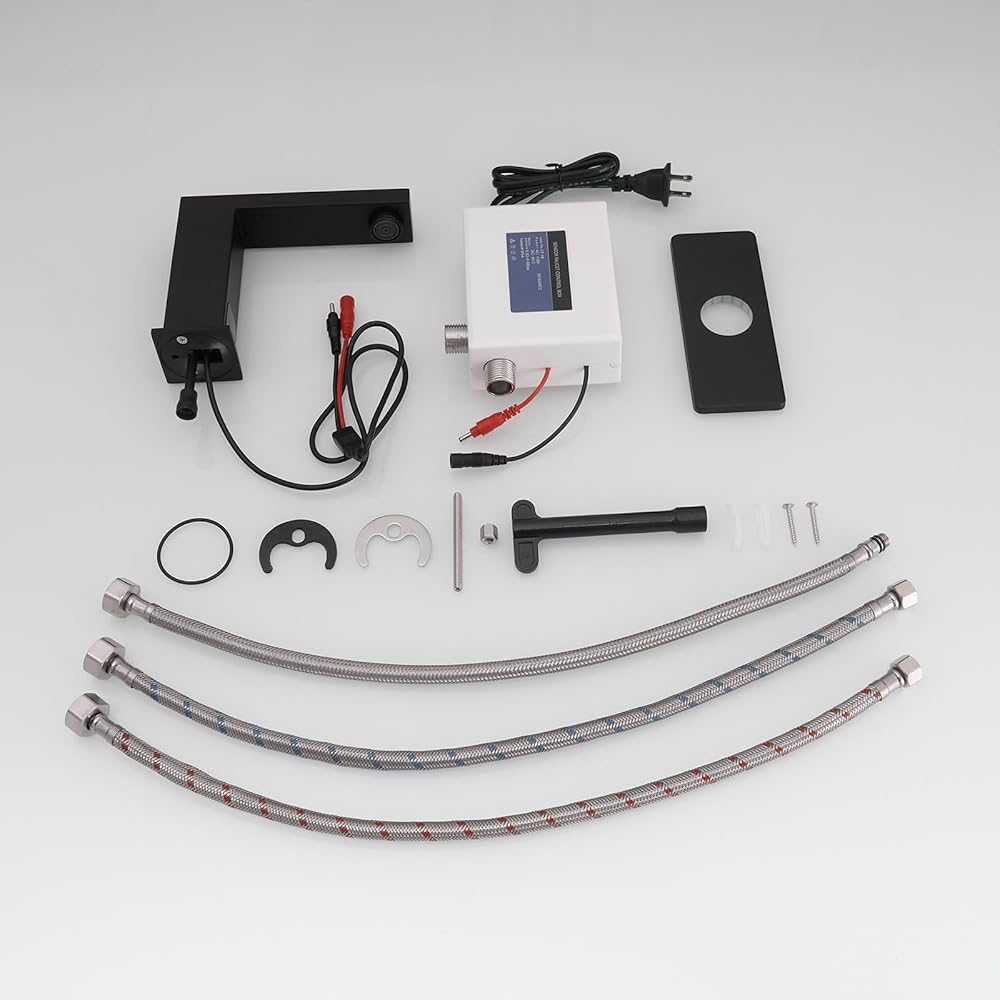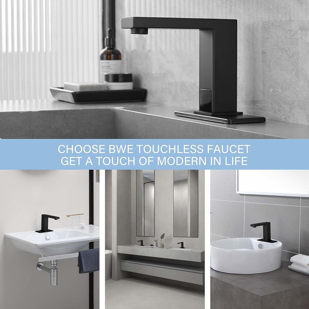 BWE Black Touchless Bathroom Sink Faucet,Hands-Free Automatic Motion Infrared Sensor Faucet,with Control Box and Temperature,Battery or Plug in Powered,Matte Black
