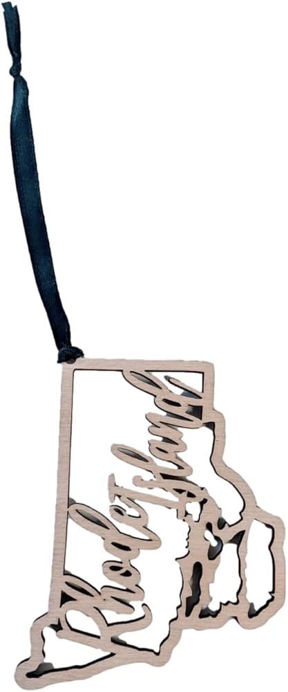 Rhode Island Christmas Ornament. A modern twist on the typical state shape! Ornament your tree this year to achieve a rustic Christmas look. Made from laser cut wood and black ribbon, Measures 3.5"l x 4" h x 0.25-inch depth.