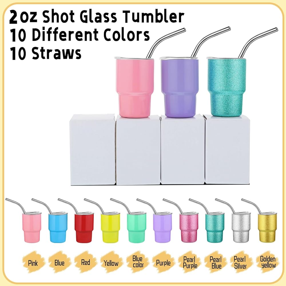【Shot Glass Tumbler Set】You will receive 10 pcs mini tumbler shot glasses with lids and 10 pcs straws, each tumbler shot glass with a capacity of 3oz and available in a set of 10 mixed colors.