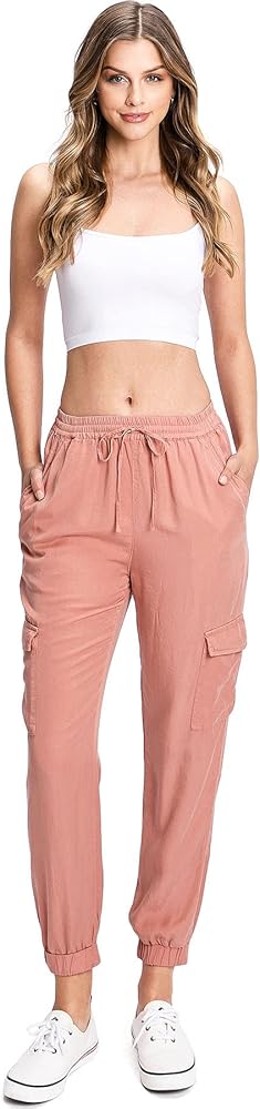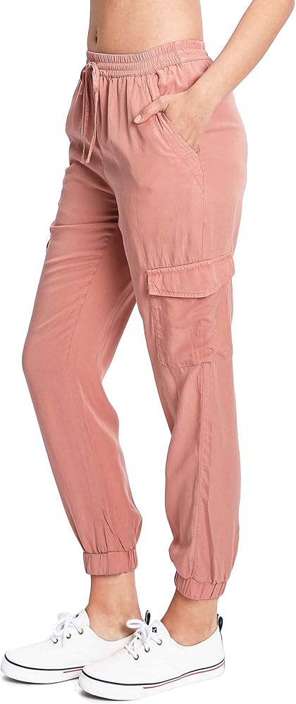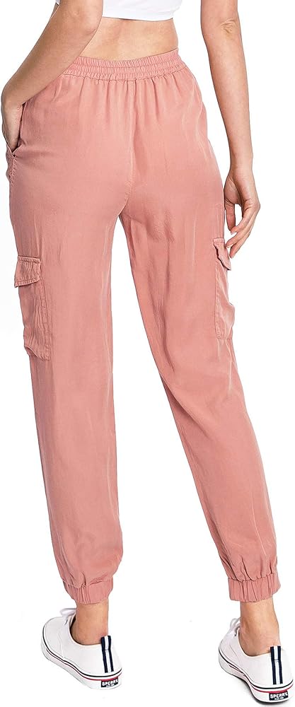 Light weight, jogger pants with a high rise fit, a stretchy smocked waist and adjustable drawstring.Pockets at the sides and flap pockets mid-thigh. Tapered elasticized ankle length. Relax fit lounge style, great for everyday wear.