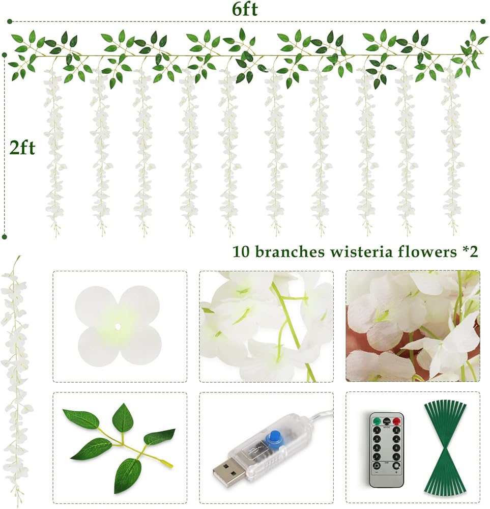 【Package Included】- 2Pcs artificial wisteria vines &1pcs LED string light 120LEDs (Powered by USB,13.12ft ). Total 20 bunches of artificial wisteria flowers, each pack contains a 6ft long main stem with 10 flower branches stretching 2ft each. 20 bunches of artificial wisteria flowers, each pack contains a 6ft long main stem with 10 flower branches stretching 2ft each.