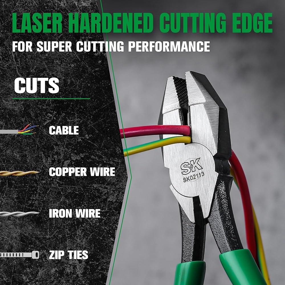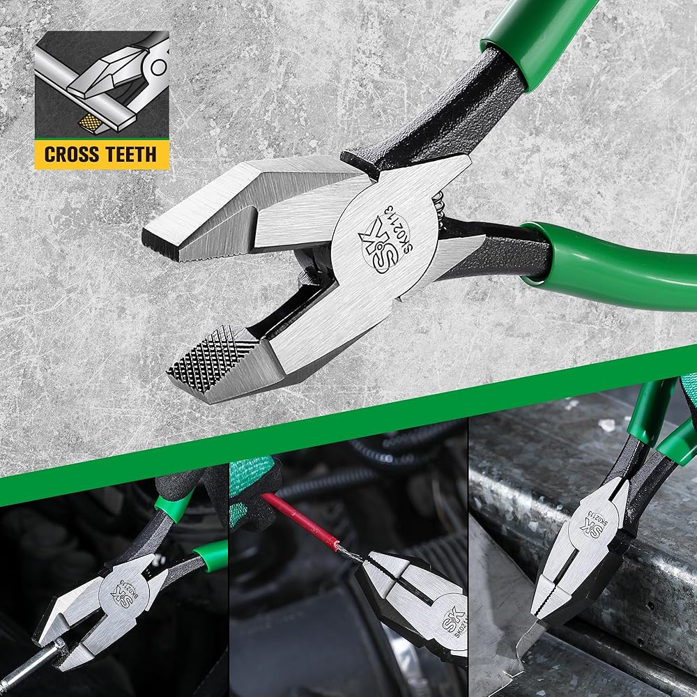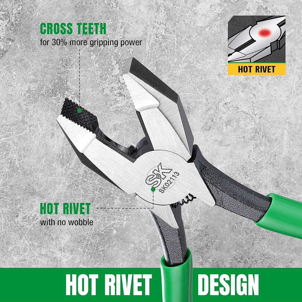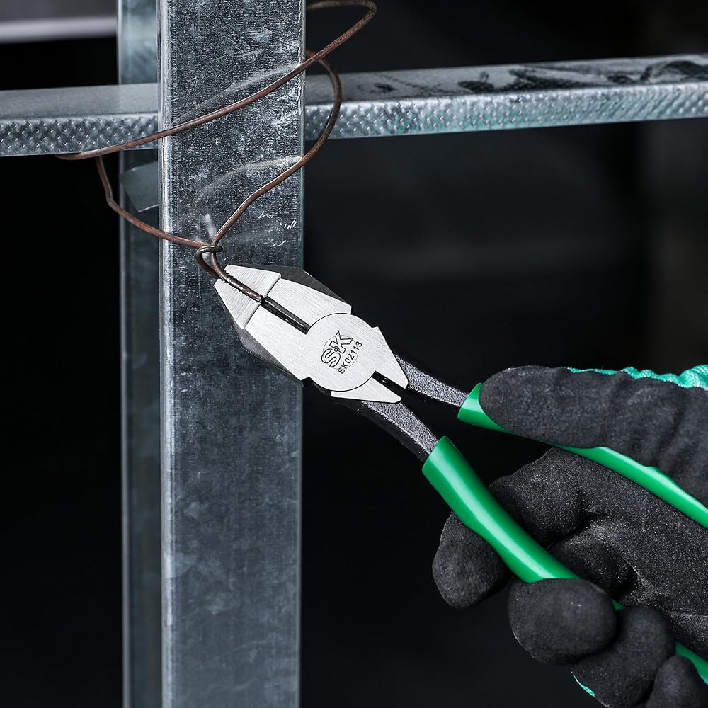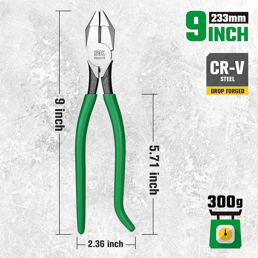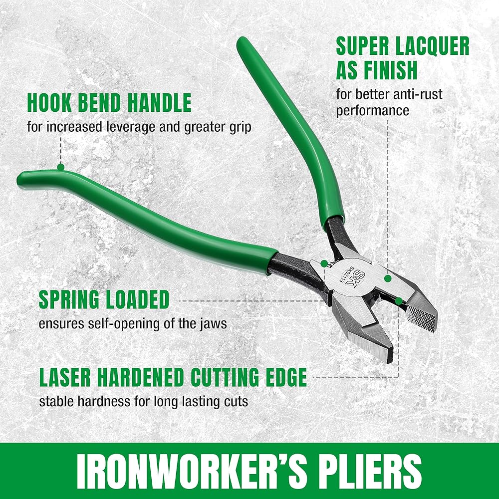 SK 9" Ironworker's Pliers, Wire Cutters With Heavy Duty Knurled Jaws, Spring Loaded Side Cutters, Premium CR-V Steel Construction, Linesman Pliers With Hook Bend Handle