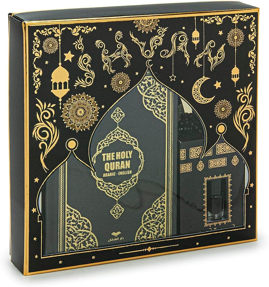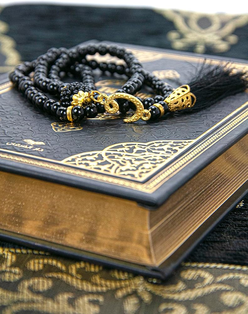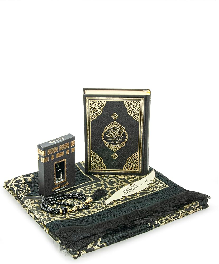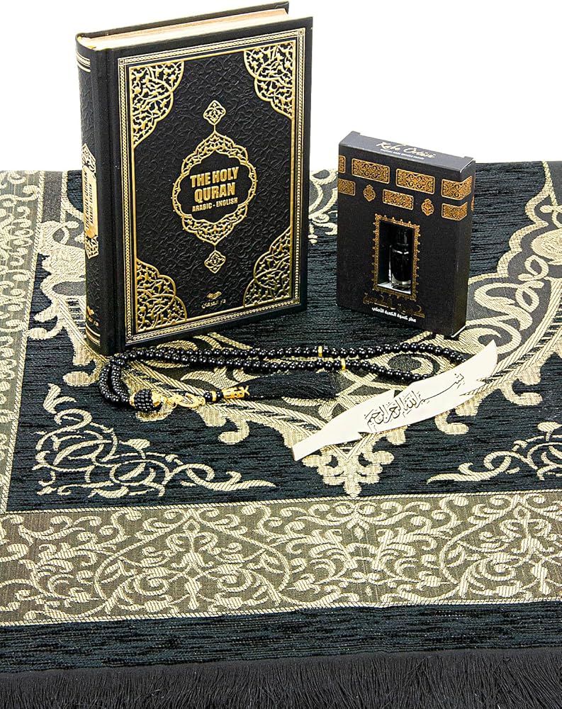 ihvan online Prayer Gift Set for Hajj and Umrah, Muslim Prayer Rug, Prayer Mat, Beads Taasbih, Holy Quran Translated English, Muslim Praying Mat, Islamic Gift Set for Ramadan & Eid, Black