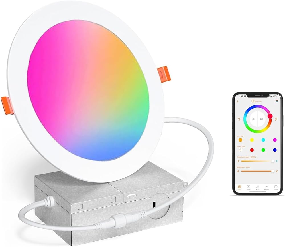 ✅【High Quality & Damp Rated Design】This color changing smart recessed lighting ultra-thin body, no flicker, silent, instant start. And damp rated design allows installation in showers, bathrooms, kitchens, and covered outdoor areas. Easy installation into 5.66in - 6.22in ceiling holes with included junction box and spring clips.