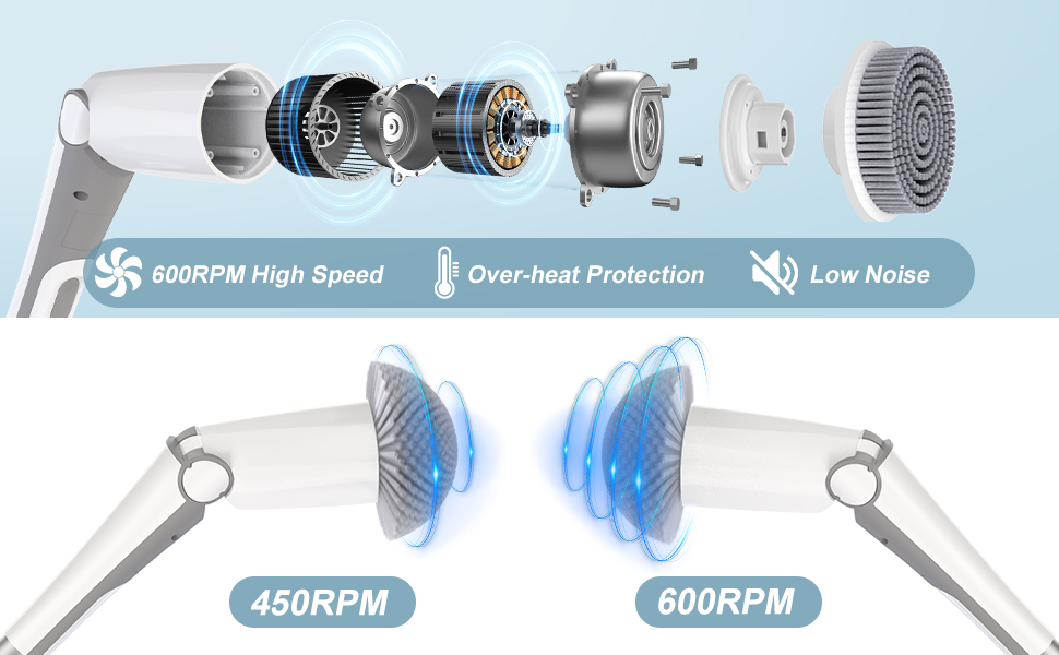 ❀ [ENHANCED DUAL POWERFUL SPIN SPEEDS]: Equipped with dual powerful 450RPM and 600RPM spin speeds. The 600RPM is used for stubborn stains or very dirty surfaces. You can easily clean your bathroom, bathtub, shower basin, tile floor, crevices, etc. Stay away from the former edition that is of weak power, clean more efficiently! (NOTE: For very stubborn stains, soak with cleaner for 3-5 minutes before the use.)