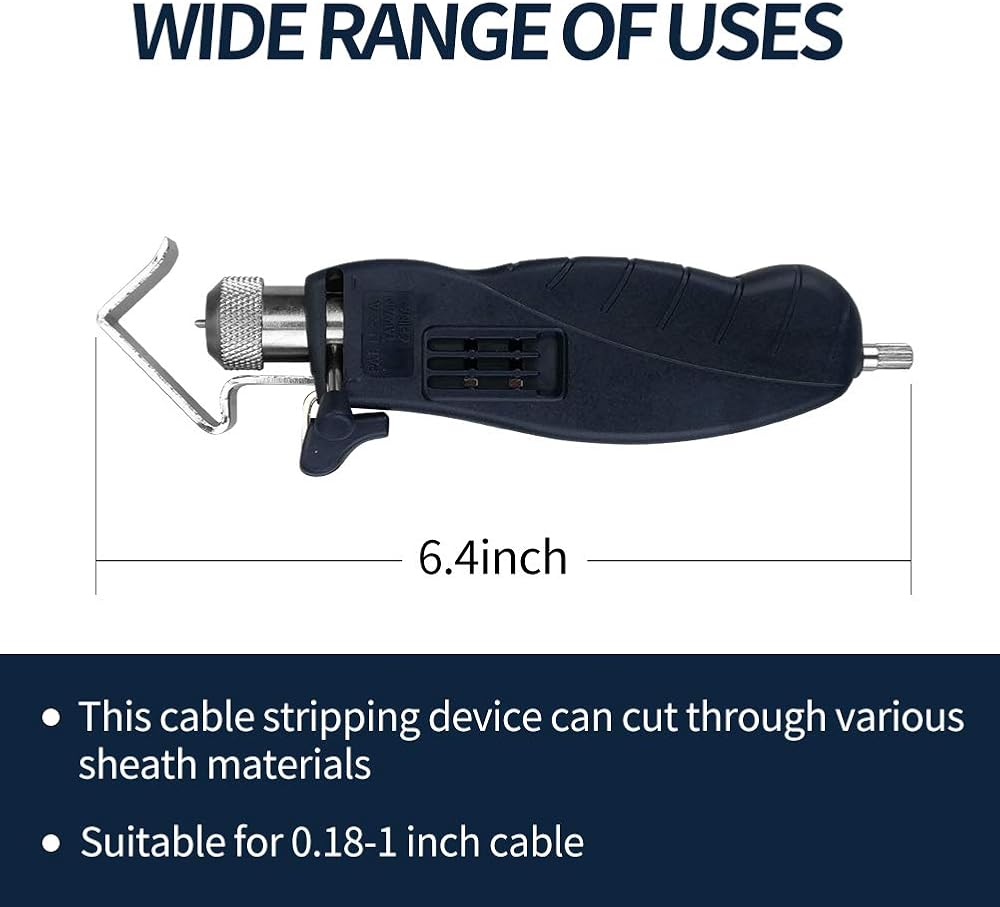 WIDE RANGE OF USES: This cable stripping device can cut through various sheath materials, easy to operate, and suitable for stripping cables of different sizes and diameters. Suitable for 0.18-1 inch cable.