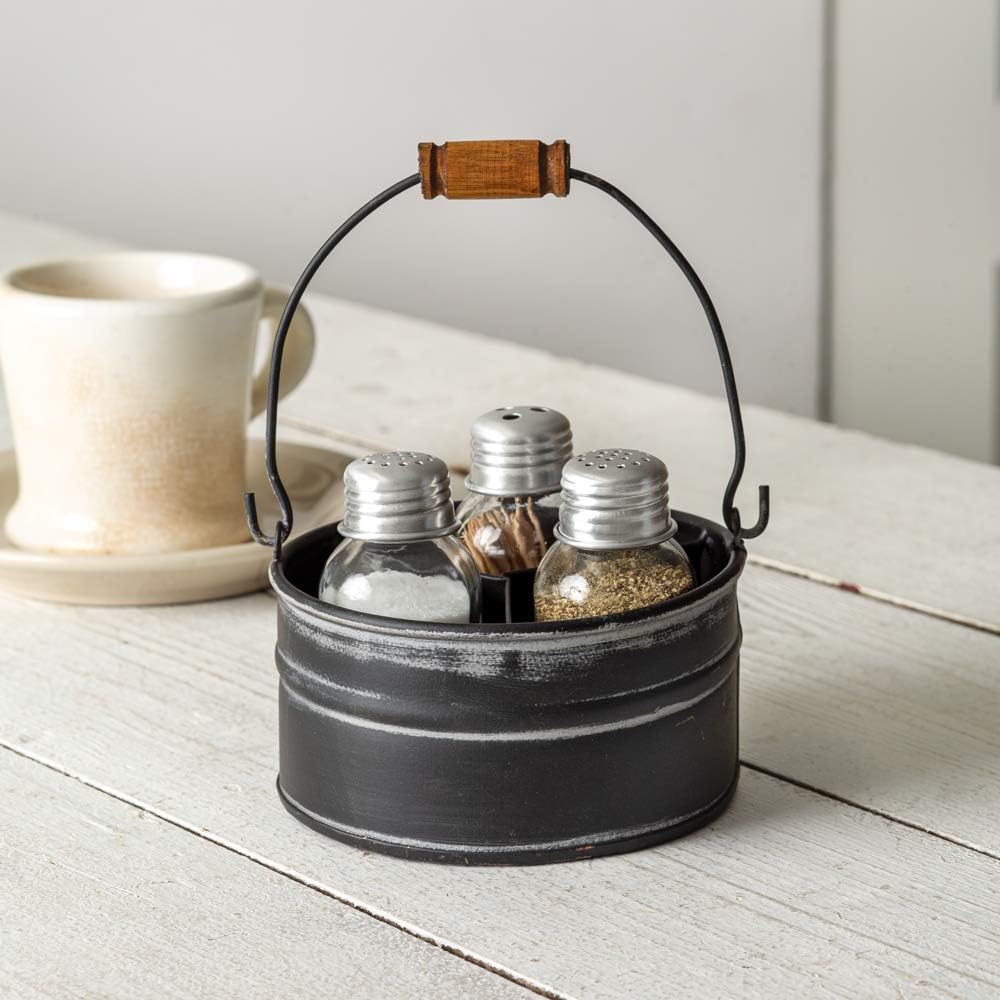 Colonial Tinworks Round Bucket Salt Pepper and Toothpick Caddy - Black, Vintage Home Decoration, and Gift in Kuwait Colonial Tinworks Round Bucket Salt Pepper and Toothpick Caddy - Black, Vintage Home Decoration, and Gift in Kuwait