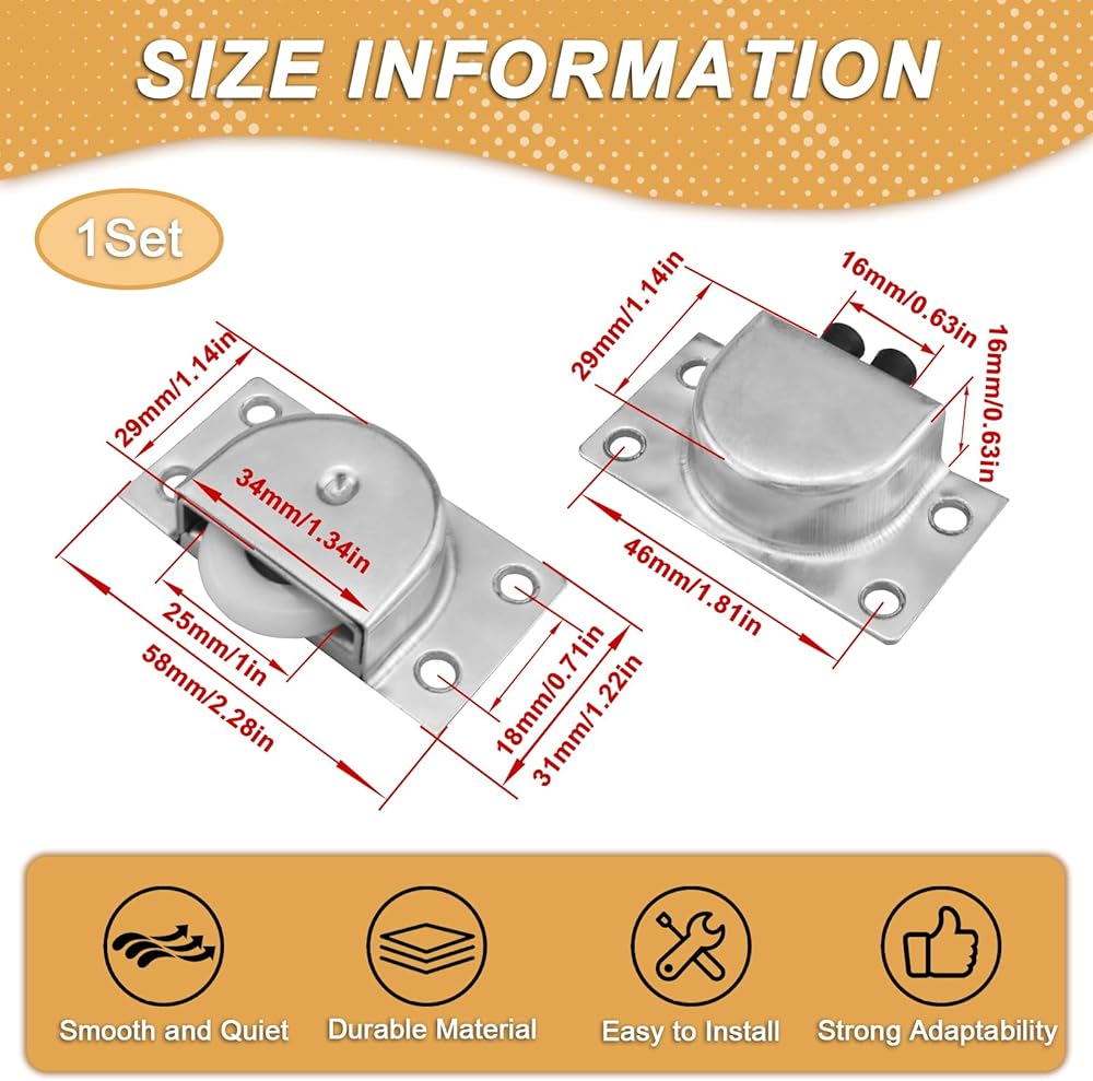 【Size and Package】You will receive two pairs of black sliding hardware rollers. Size is about 58mm x 31mm x 14mm / 2.3" x 1.2" x 0.55" (L x W x H).
