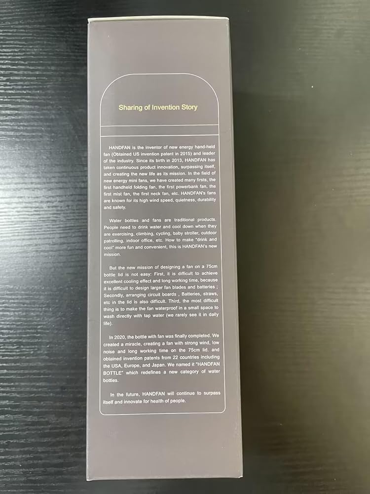 [THE INVENTOR OF FAN WATER BOTTLE]: We are HandFan, the inventor of fan water bottle .Surpass is the driving force of human progress, health is the eternal pursuit of people. Food-grade tritan material,BPA-free,Micro-filter, 20oz capacity, 15 hours working time, strong wind.The fan is waterproof. We named it “HandFan Bottle”