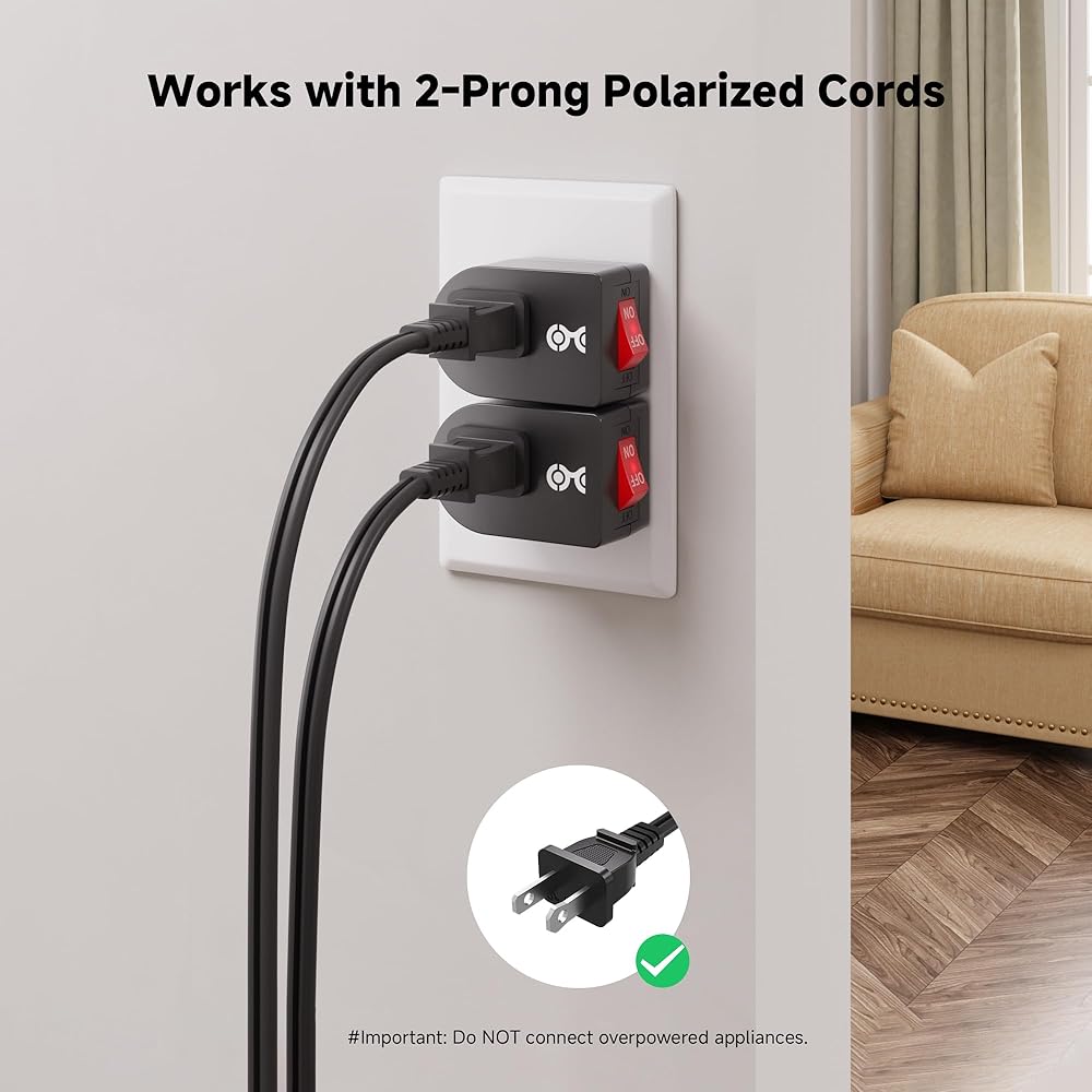 يحتوي قابس المنفذ الواحد 2P مع المفتاح على منفذ طاقة واحد لسلكين مستقطبين؛ قم بتوصيل أضواء المناسبات الخاصة بمفتاح 120 فولت هذا وقم بتشغيلها وإيقاف تشغيلها في أي وقت باستخدام مفتاح التوصيل ذو الشقين هذا