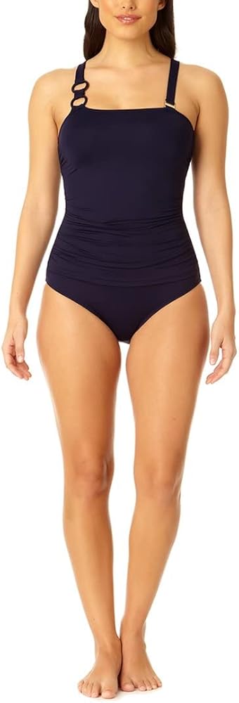 Get this Anne Cole Ring Strap Asymmetric One-Piece for your bold yet gorgeous looks. Full coverage. Pull-on style. Adjustable straps. One removable strap. Removable cups. V-shape bottom. 82% nylon, 18% spandex. Hand wash, dry flat.