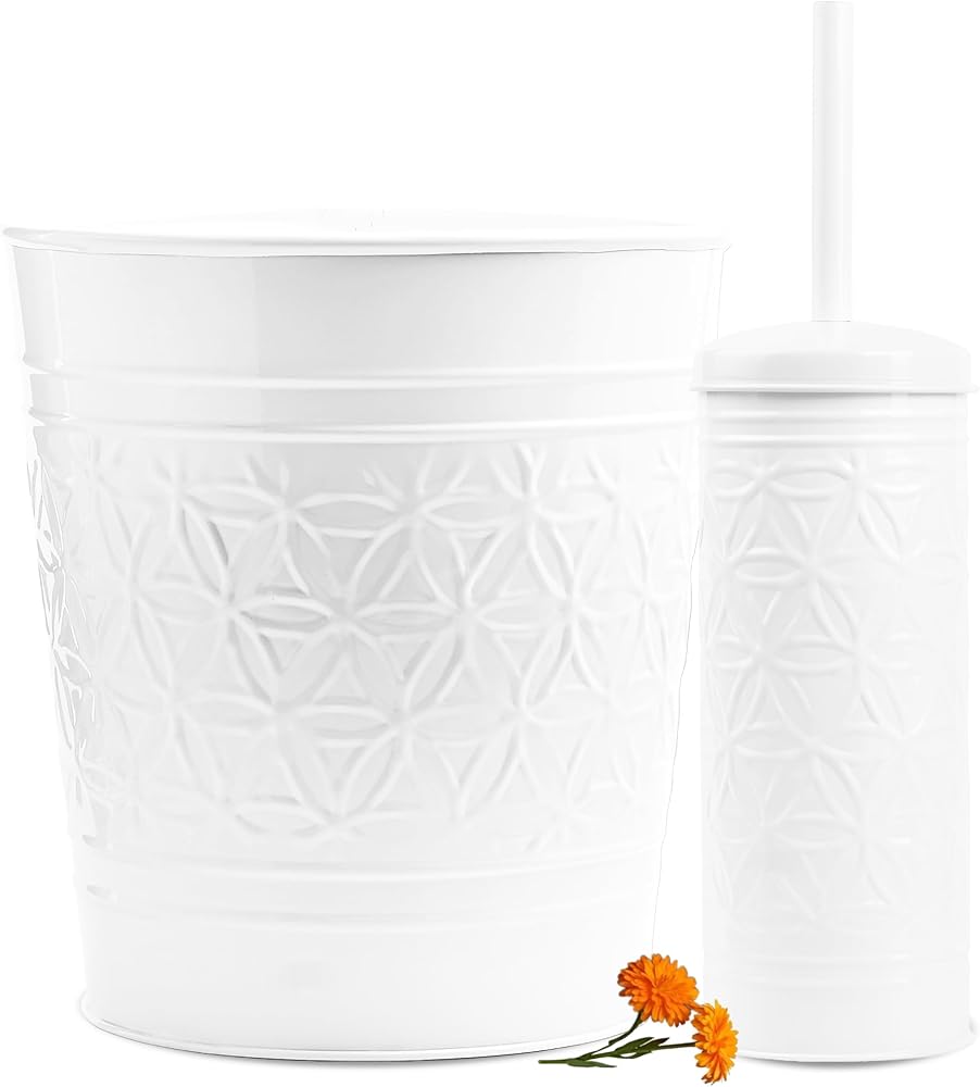 Coordinated Design - Set of gloss white bathroom accessories featuring an embossed white toilet bowl brush with holder and a stylish small white trash can, crafted with attention to detail for a cohesive look. Perfect for adding a touch of farmhouse charm to your bathroom farmhouse decor