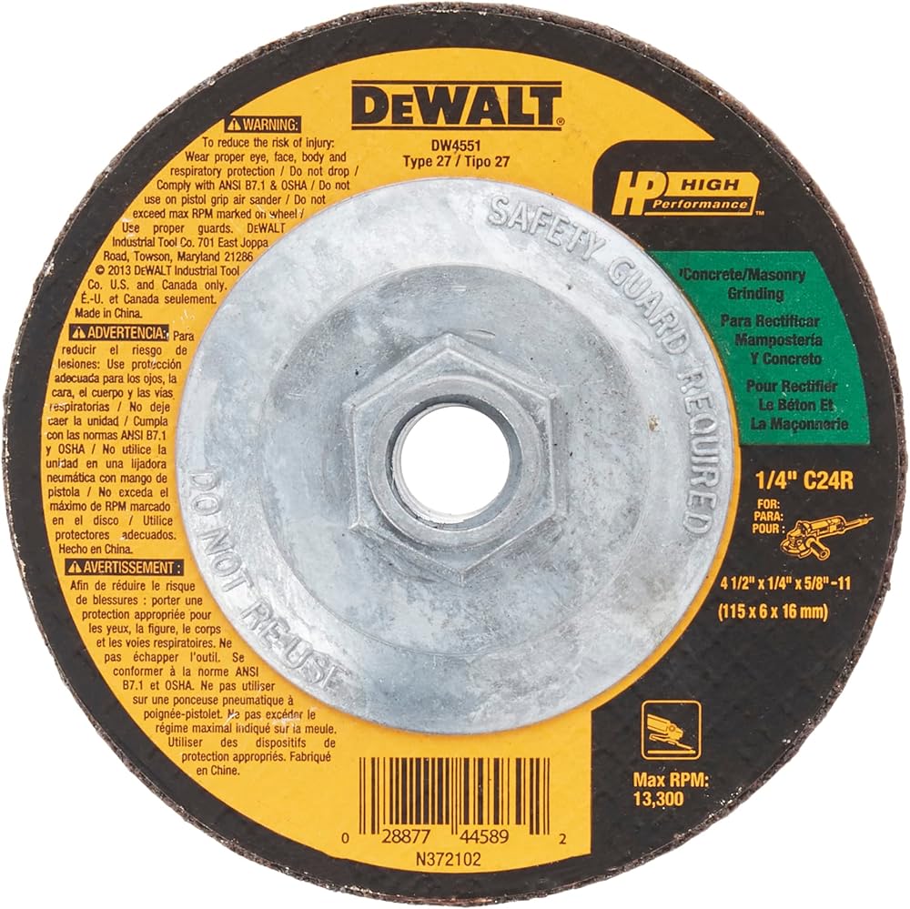 DEWALT High Performance Masonry Cutting and Grinding wheel have a silicon carbide grain for long wheel life in all masonry materials. They have a high grain concentration for aggressive grinding action and smoother running wheels. The proprietary wheel design ensures durable long life wheels and 3 full sheets of glass in every 1/4-Inch wheel and 2 full sheets in every 1/8-Inch wheel added durability and user safety. These wheels are ideal for grinding and cutting concrete, cast iron, ductile iron, and other masonry materials.