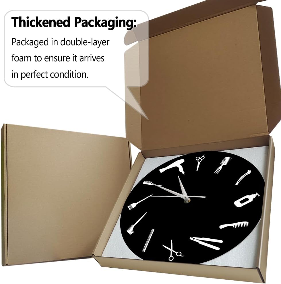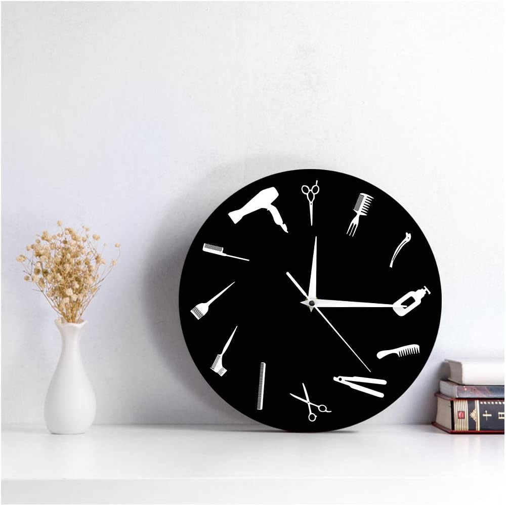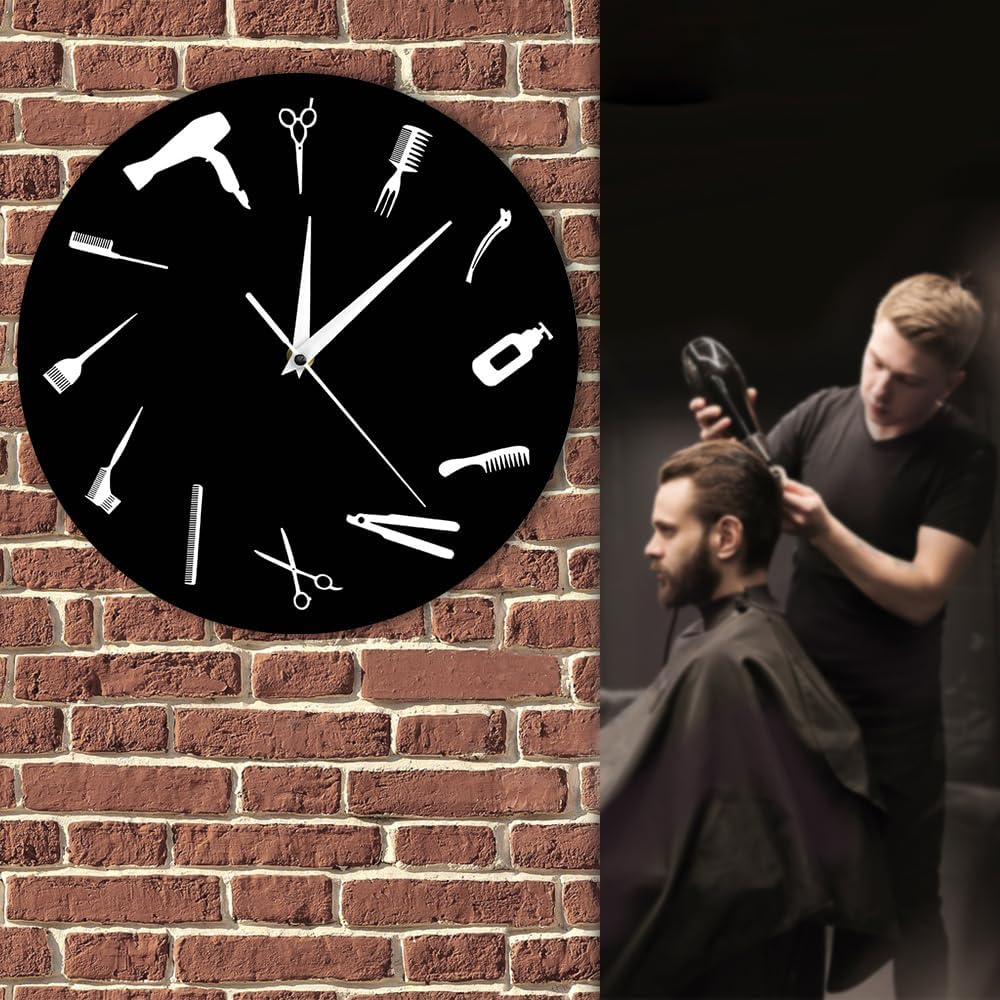 Unique Design: The hair salon wall clock is made of high quality black plastic, each hour of the clock marked by the large white barber tools. Beauty salon signs for business.
