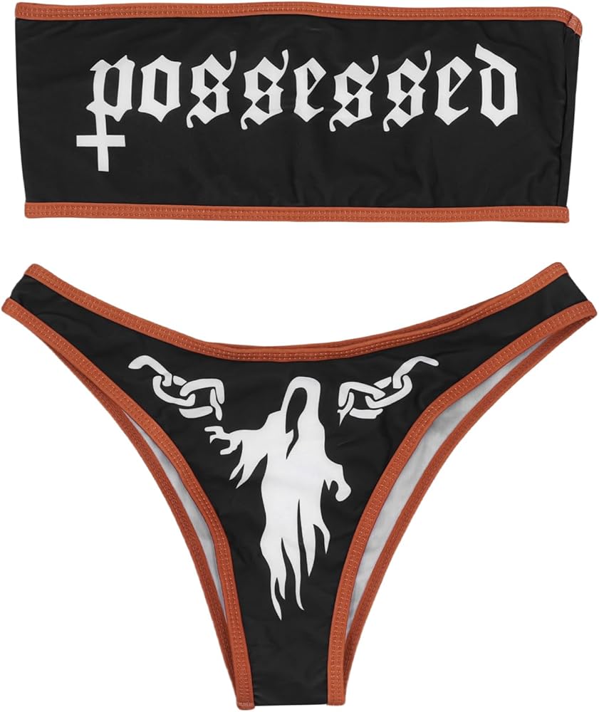 ZGMYC Women's Letter Skull Print Goth Swimsuit 2 Piece Sexy Strapless Bandeau Bikini High Waist Bathing Suit for Rave Festival Halloween