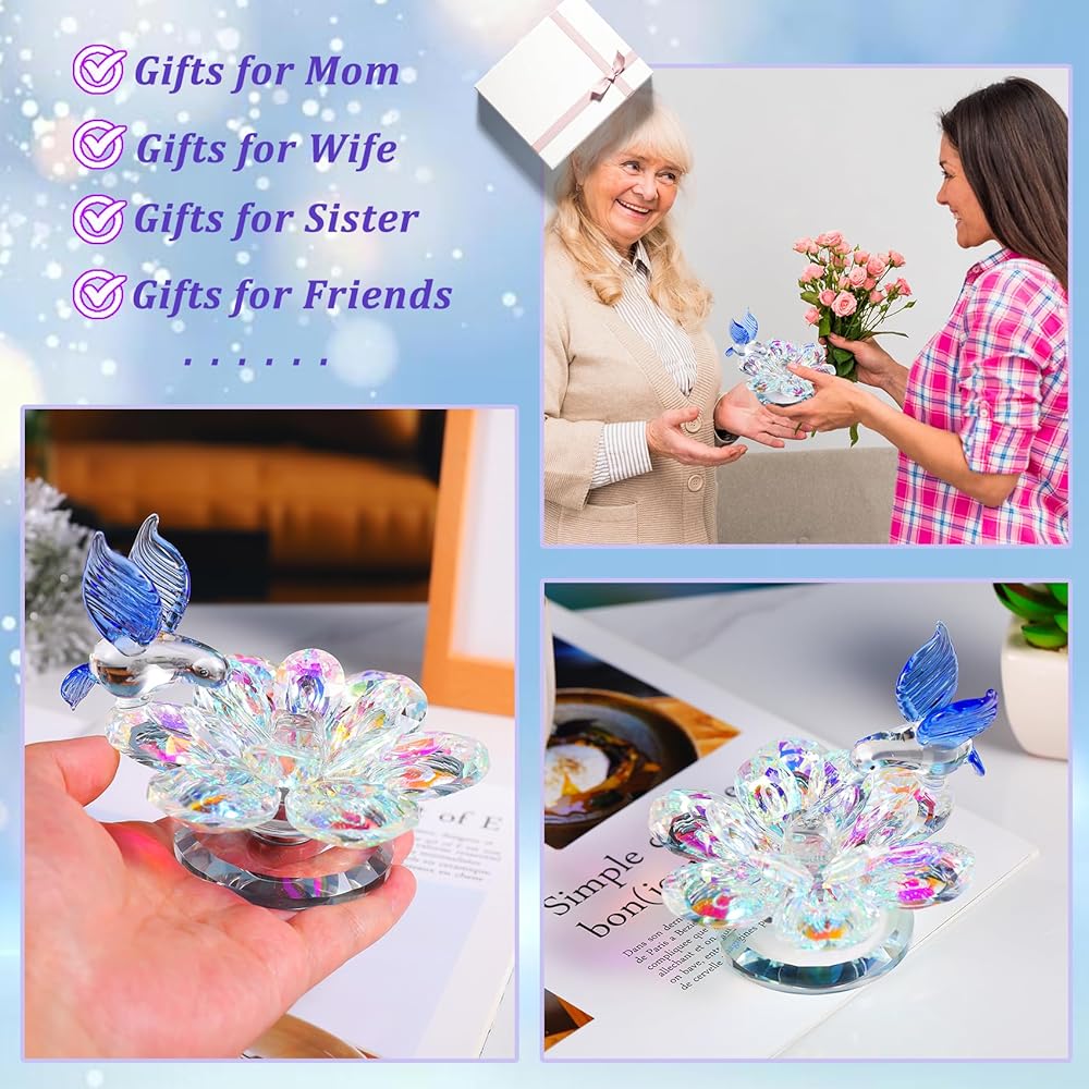 ✨Gift Box Packaging: Beautifully packaged gift box, the gift is exquisite and elegant. The packaging includes crystal flower and hummingbird figurine, gift box, gift card and wiping cloth. All items are properly packed to ensure they arrive undamaged (It is easy to clean with a soft cloth and not easy to stain)