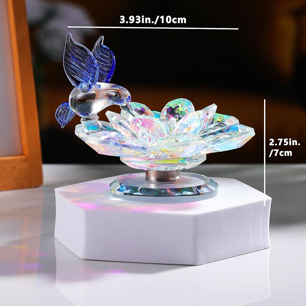 ✨Flower and Hummingbird Figurine: Crystal flower with swivel base is handcrafted from crystal glass, The material can be used for a long time. The hummingbird beside the flower is beautiful and sparkling, the flower is iridescent in color, and the bird is clear and purple. Dimensions: 4 inches (Length) x 4 inches (Height)