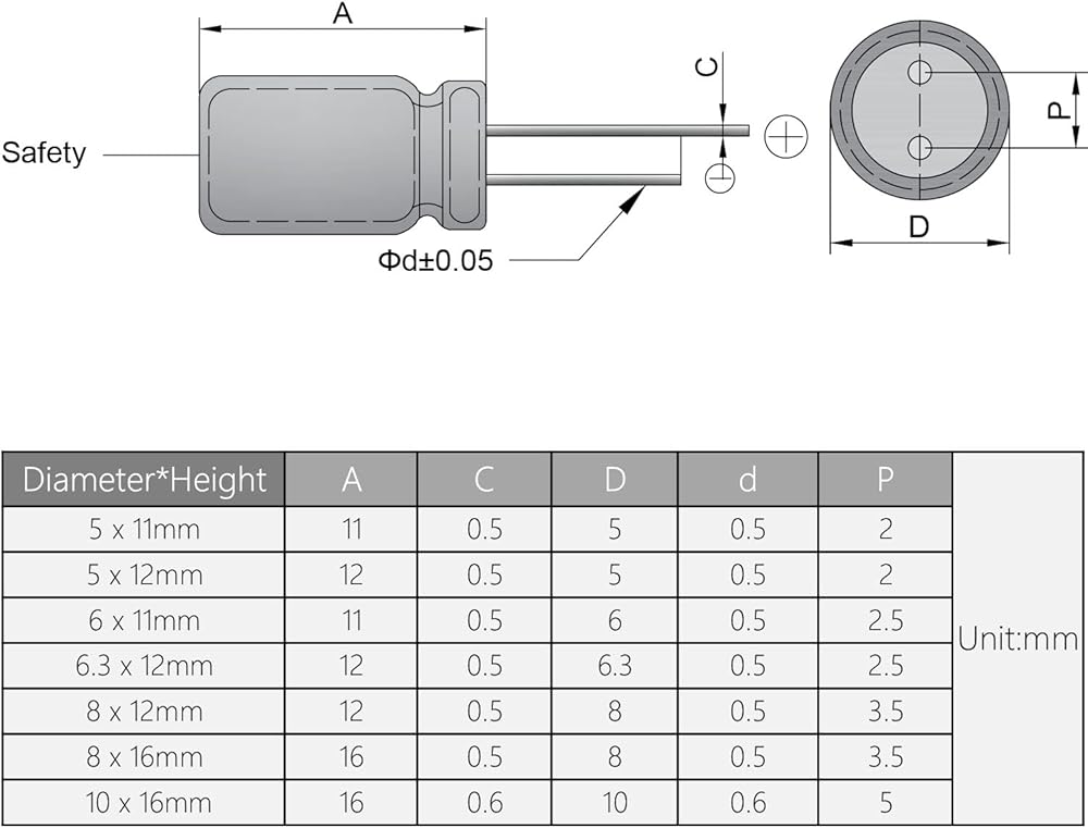 Capacitor dimension:5x11mm/0.2"x0.43"