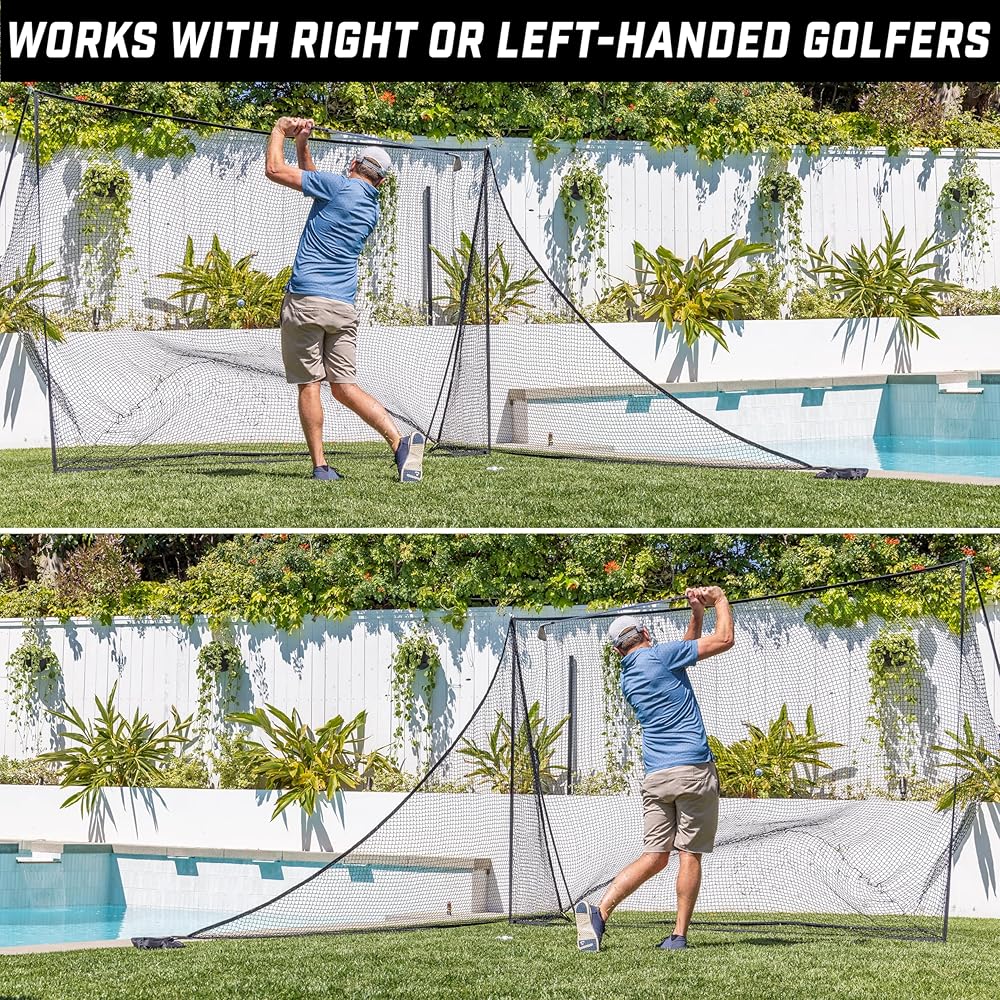 LEFT OR RIGHT HANDED: Attaches to either side of your golf net to work with both left or right handed golfers; Purchase 2 nets if you need protection on both sides at the same time