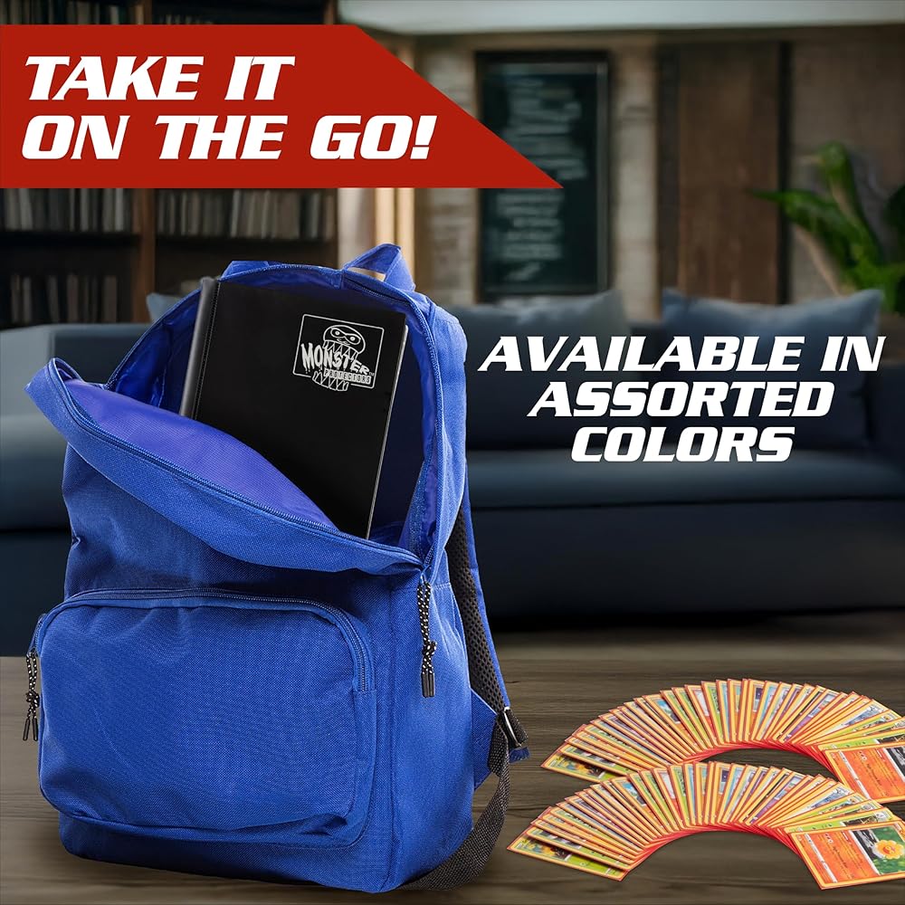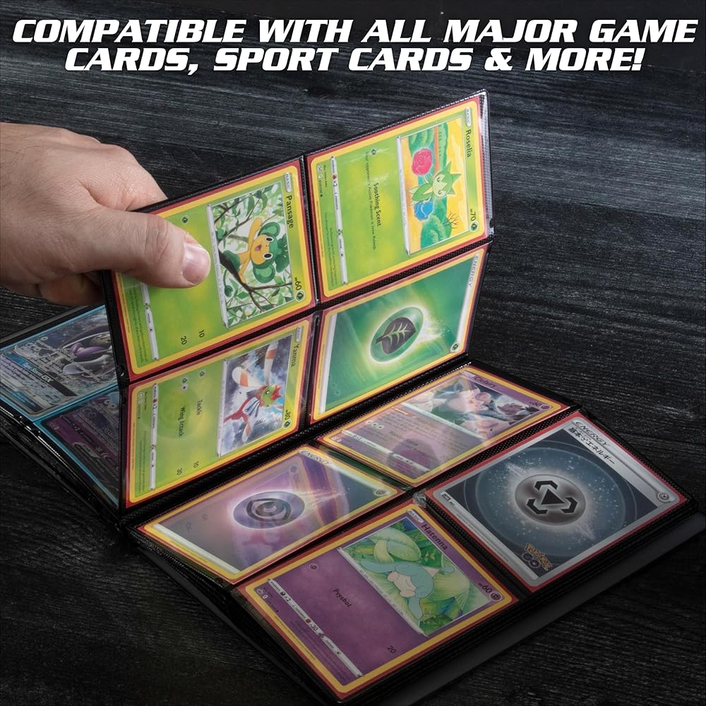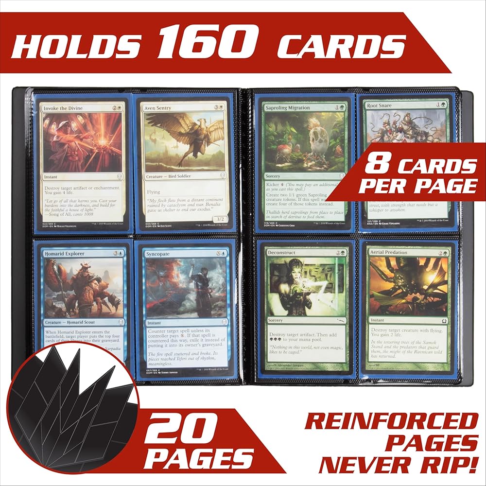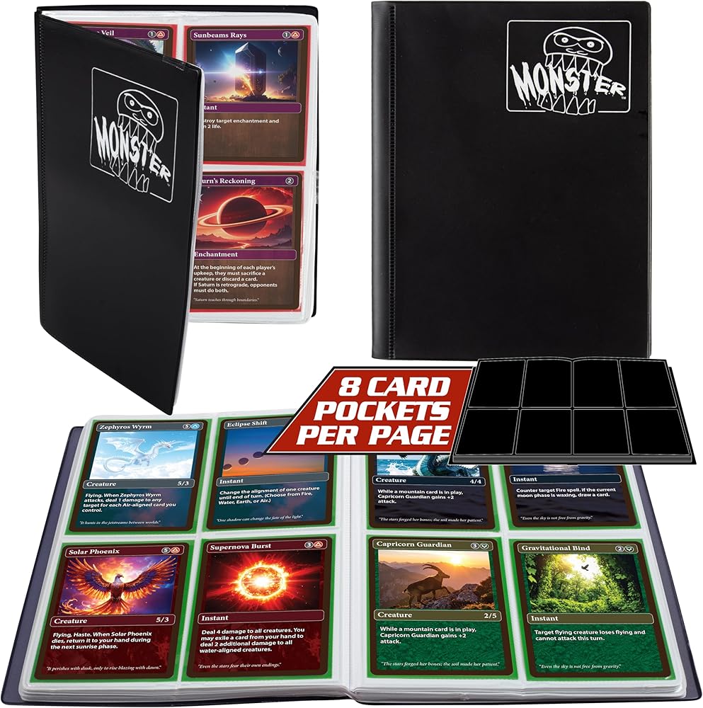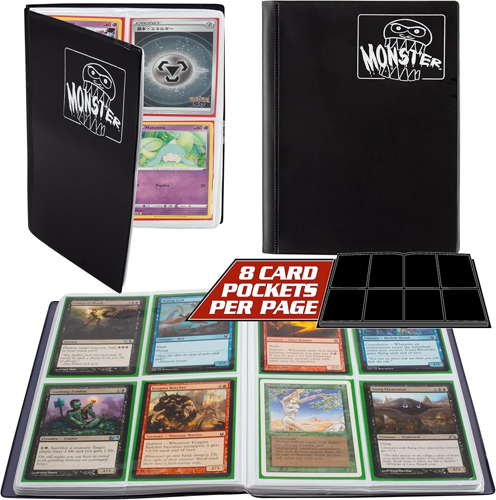 Monster Binder - 4 Pocket Matte Black Album with WHITE PAGES- Holds 360 Yugioh, Magic, and Pokemon Cards: 160 card carrying capacity side loading pockets with built in AntiTheft system. Cushioned pages for added protection. Pages are actually sewn in for added durability. Custom binding expands as you put more cards into it. Monster Protectors binders, albums, and portfolios are the most in-demand binders on the TCG market. There is no other product that matches the level of storage space and durability. These binders feature a 160 card carrying capacity, with side loading pockets that are both antitheft and prevent your cards from slipping out of place. Each of the pages is cushioned to give your cards an extra level of protection. Monster Protectors binders also feature a custom binding that expands as you put more cards into it, so the cover always stays flush against the pages, never exposing your cards to harm. All of the pages are also stitched in rather than being glued in so the binders are incredibly durable and last for years.