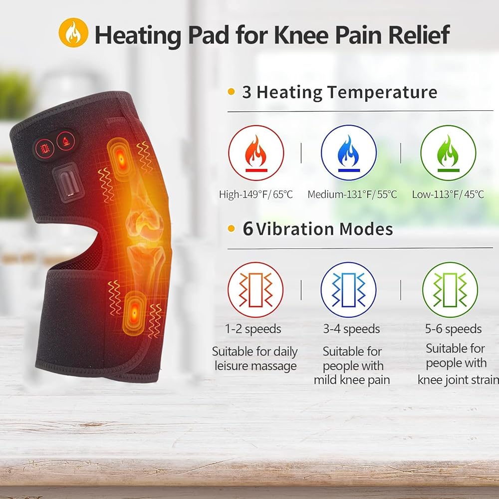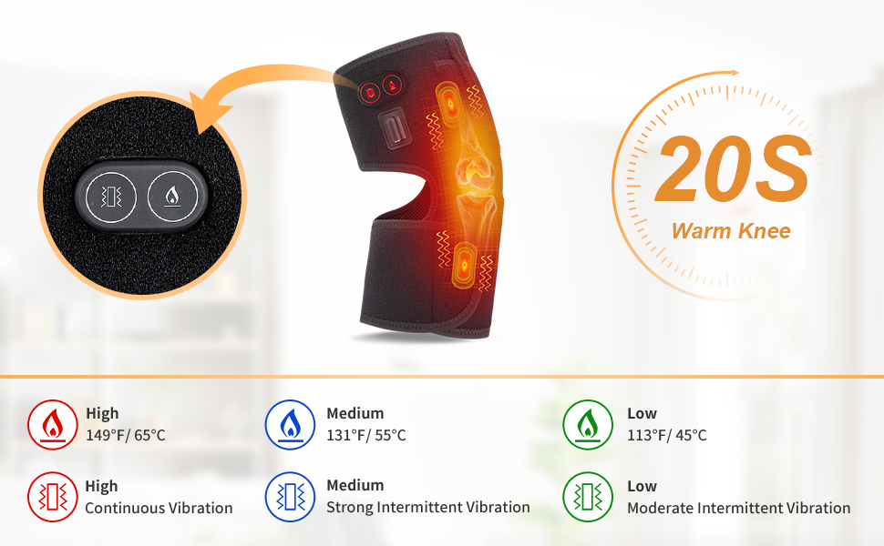 Adjustable Temperature and Vibration Intensity: The three-speed constant temperature of knee heating pads : 45°C/113 °F, 55°C/131°F, 60°C/140°F, adjust with the heart, upgrade to increase the heating braces , so that the knees fully enjoy the massage heating effect brought by the knee massager. The vibration massage and heating knee braces not only can be used independently, can also be used together.