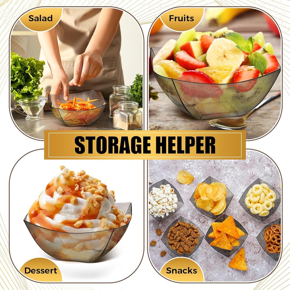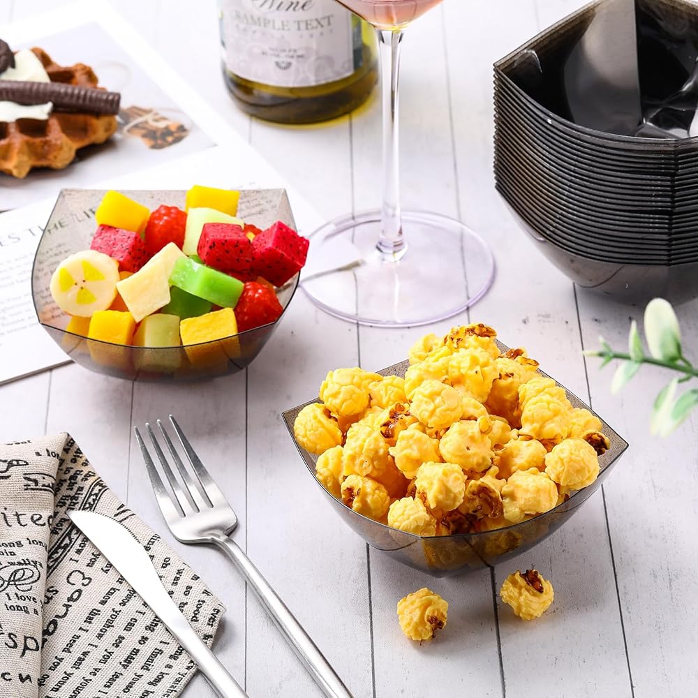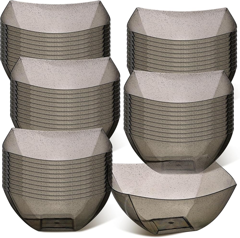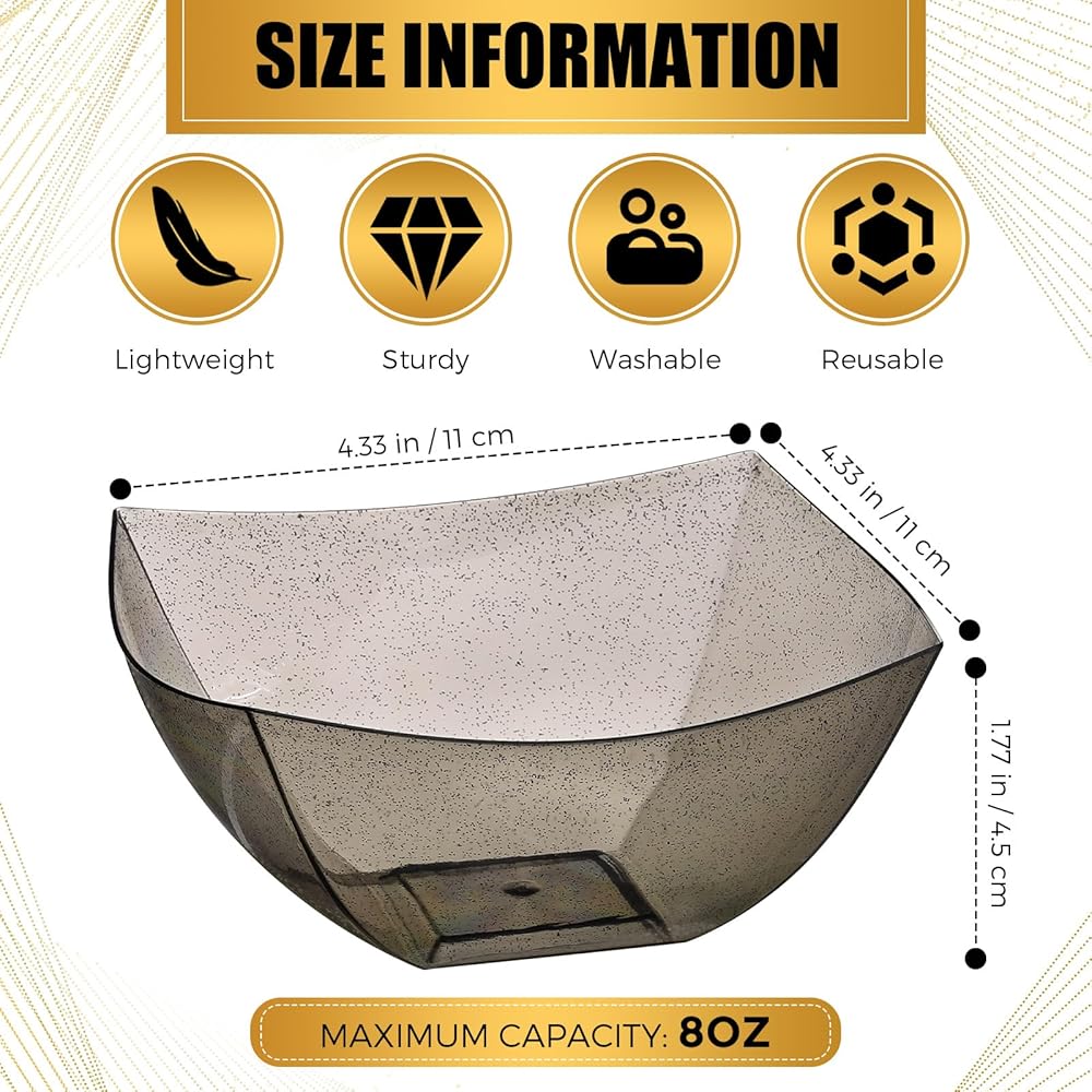 What You Will Get: you will get 50 pieces of square plastic disposable bowls for parties altogether, available in gold glitter, 8 ounces, suitable for parties, family dinners, holidays and so on; The adequate quantity can satisfy your various demand