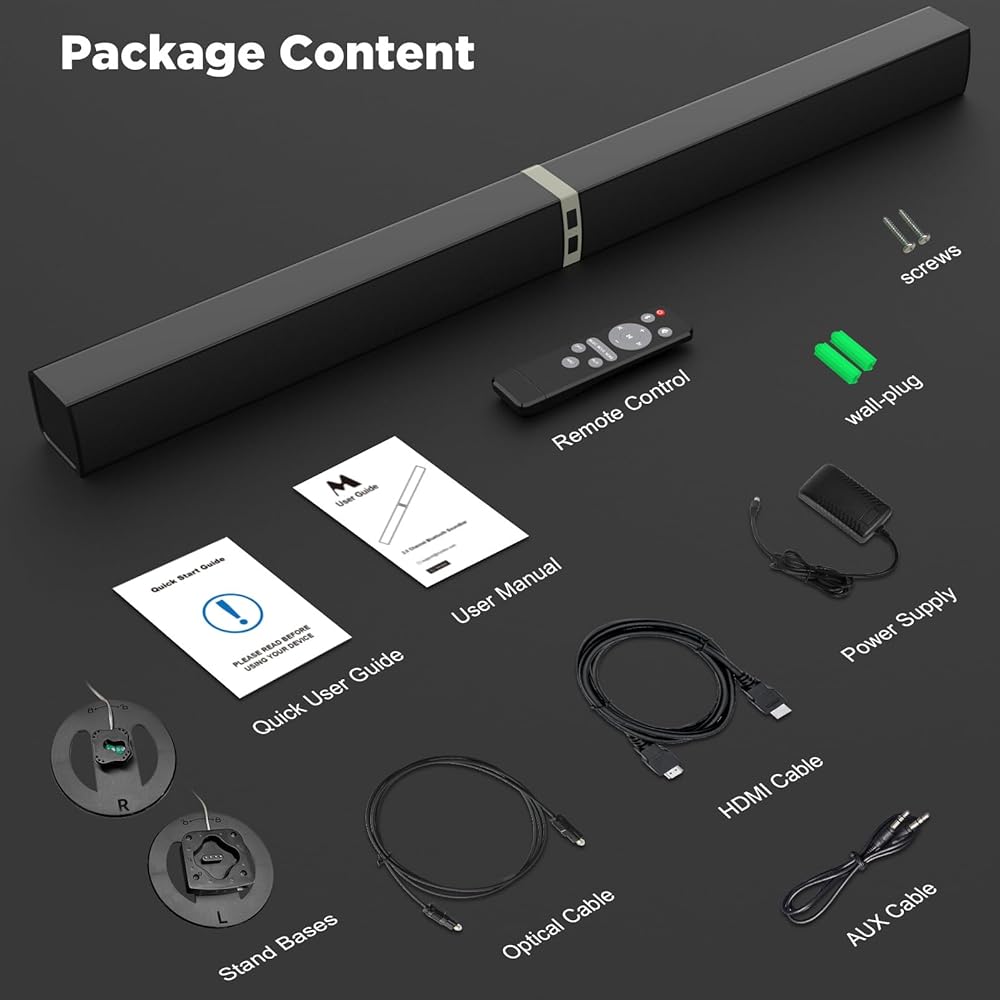 ✅Reliable Support: Your satisfaction is our top priority. Experience the exceptional quality of our soundbar, backed by a life-time after-sales service. Our team is always available to provide any support you need within two days. The package includes the TV Soundbar, Remote Controller, Power Adapter, HDMI/Optical/3.5mm audio cable, base, quick installation instructions, and user manual.