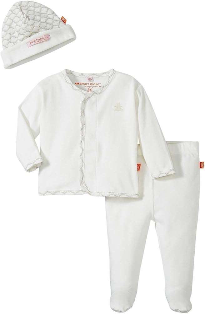 Our time-saving Smart Close magnetic fasteners and no over-the-head design gets baby dressed quickly while significantly reducing their exposure to the chilly air. Great for new moms and dads during night changings. Accented with adorable embroidery. [WILL NEED TO MAKE SURE THIS APPLIES IN EVERY CASE OR NOTE THAT IT IS OPTIONAL.]. Comes with matching hat. Makes the perfect gift!