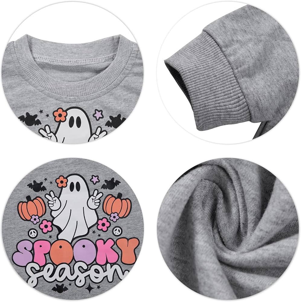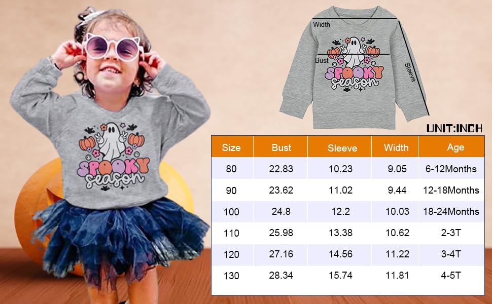 PACKAGE: 1 x Toddler Baby Halloween Sweatshirts Spooky Season Sweatshirt Ghost Face Crewneck Long Sleeve Shirt. Please choose the appropriate size according to the specific size chart.