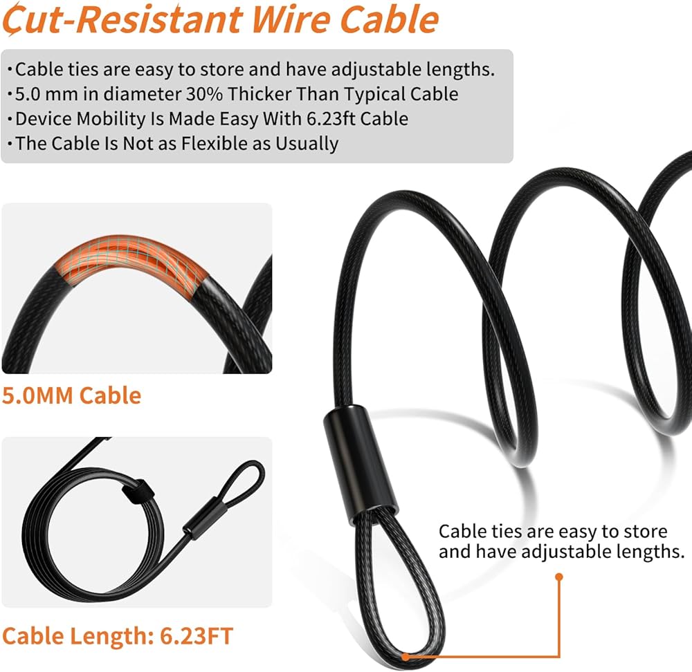 【Unique Design】This laptop lock has a double lever lock that is tougher and thicker and is composed of incredibly strong stainless steel. One-handed working is designed with a 360-degree rotating head. Cut-resistant braided steel cable with a 5 mm diameter is 35% thicker than usual. The device is easy to move around with a 7-ft perfect length.