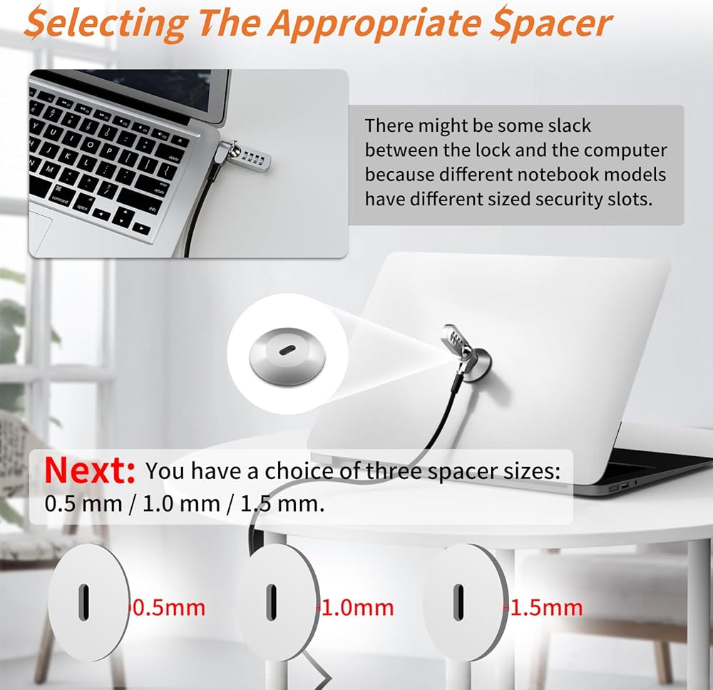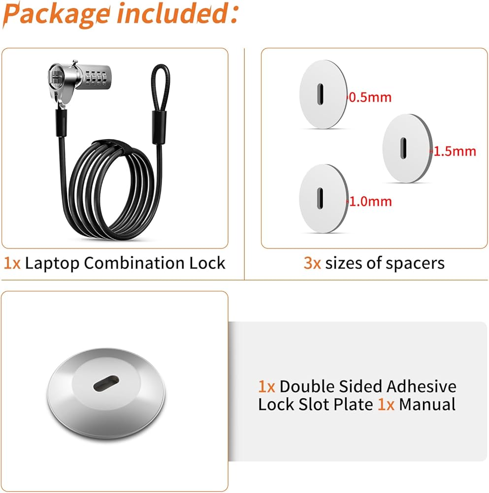【Package included】1x laptop combination lock, 1x double sided adhesive lock slot plate,a instructions manual and 3 sizes of spacers.