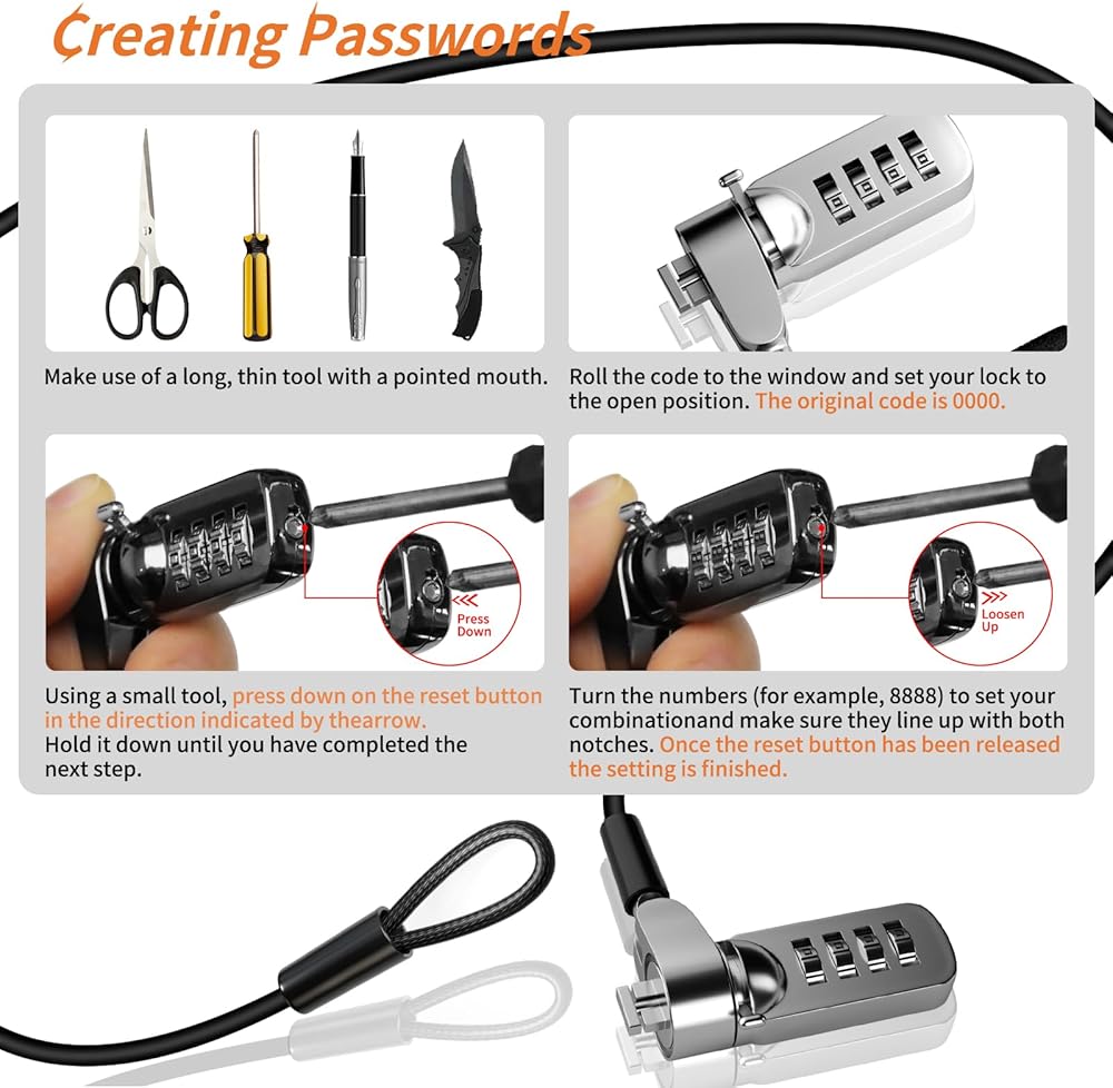 【Easy to install】You can install it with easily using the instructions manual we provided. The four-digit resettable security code that the computer locks use can be easily changed with a pen or pin tool. You may create over 10,000 distinct and personalised combinations with this adjustable combination, and you never have to worry about losing the keys.