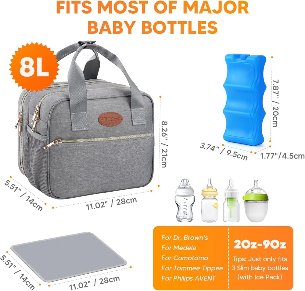 PORTABLE COOLER COMPARTMENT - The cooler room with a full waterproof& leakproof EAV lining with an ice pack, just like a ”mobile mini -fridge” keeps breast milk fresh for hours. It's a waterproof liner to prevent leakage and fits 3 baby bottles up to 9 ounces or some infant's milk storage bags.