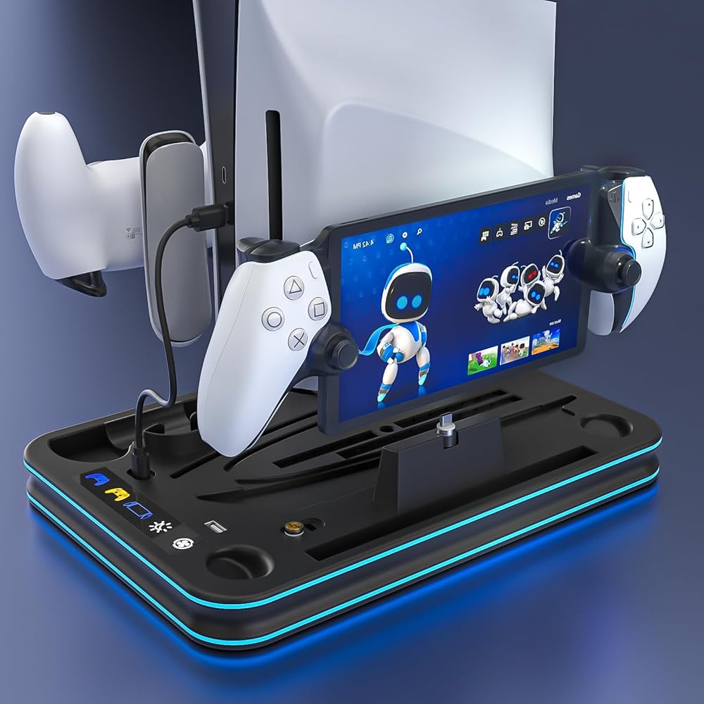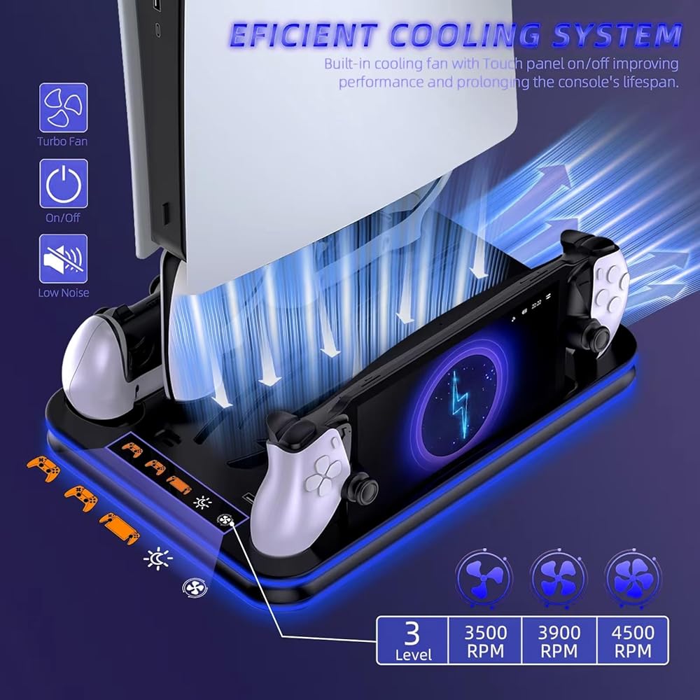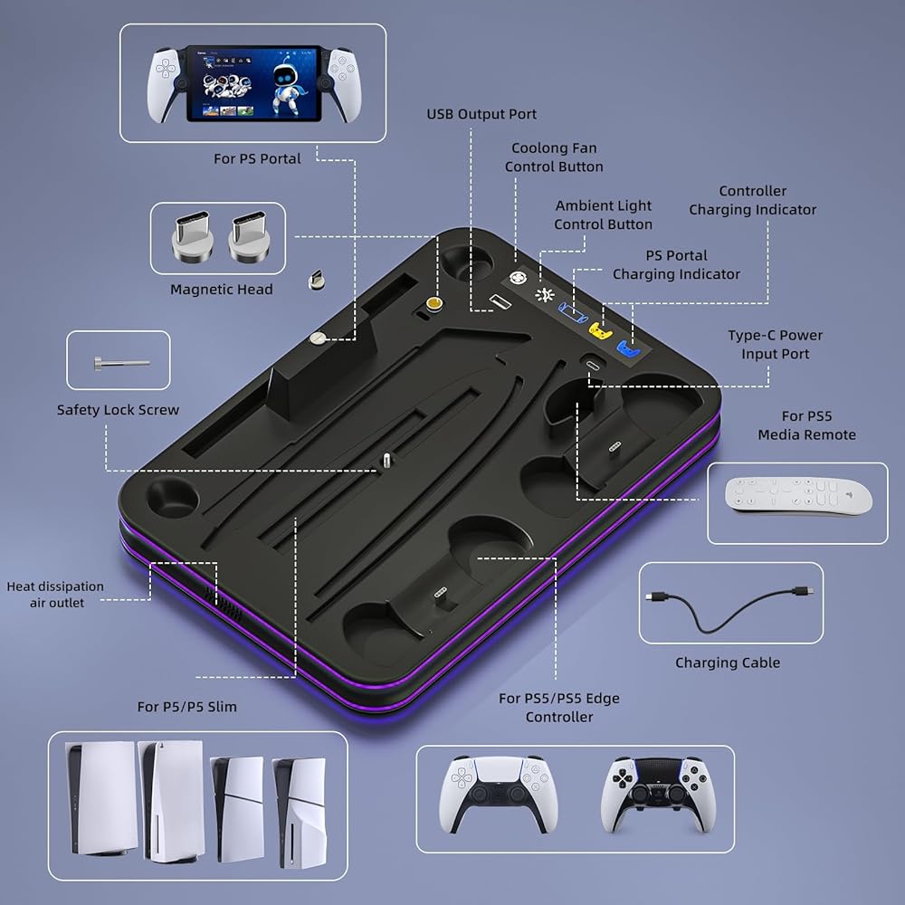 PS5 and PS Portal Charger Stand : This PS5 Cooling station can charge your PS Portal Remote Player, PS5 Dual Sense Controller, and PS5 Edge Controller at the same time. On the market, most product can not charge your PS5 Portal and PS5 Edge Controller simultaneously. Moreover, it is magnetic design for PS Portal. It is very convenient for you to charge. it can hold PS5 Headphone on the PS5 console. It can organize everything you need in one place.