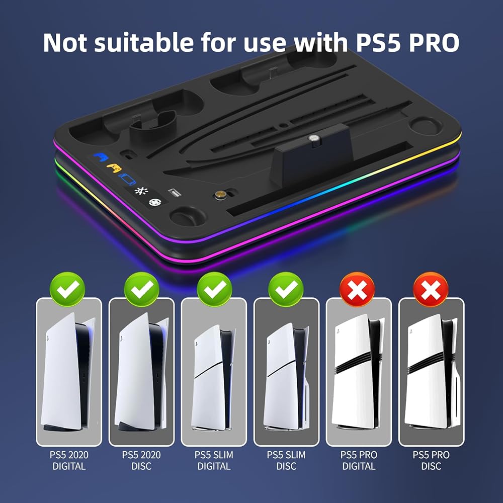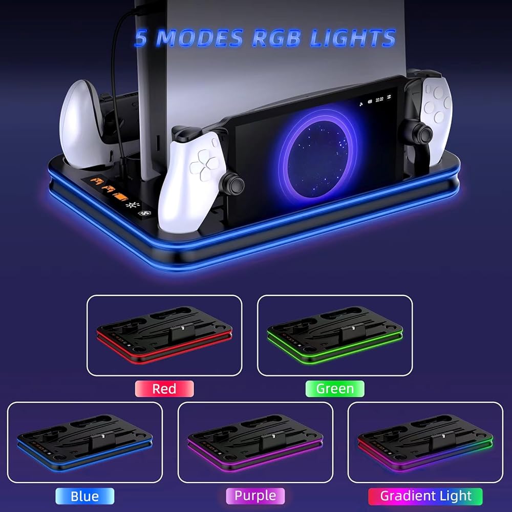 Save Space : The PS5 charging dock with efficient cooling fans and dual PS5 charger, ps5 slim cooling fan, RGB LED charging indicators. This all-in-one playstation 5 stand, keeping all playstation 5 accessories neat and tidy, making this PS5 cooling station be a better replacement for sony official PS5 charging station. Great gaming accessories for PS5 owners.