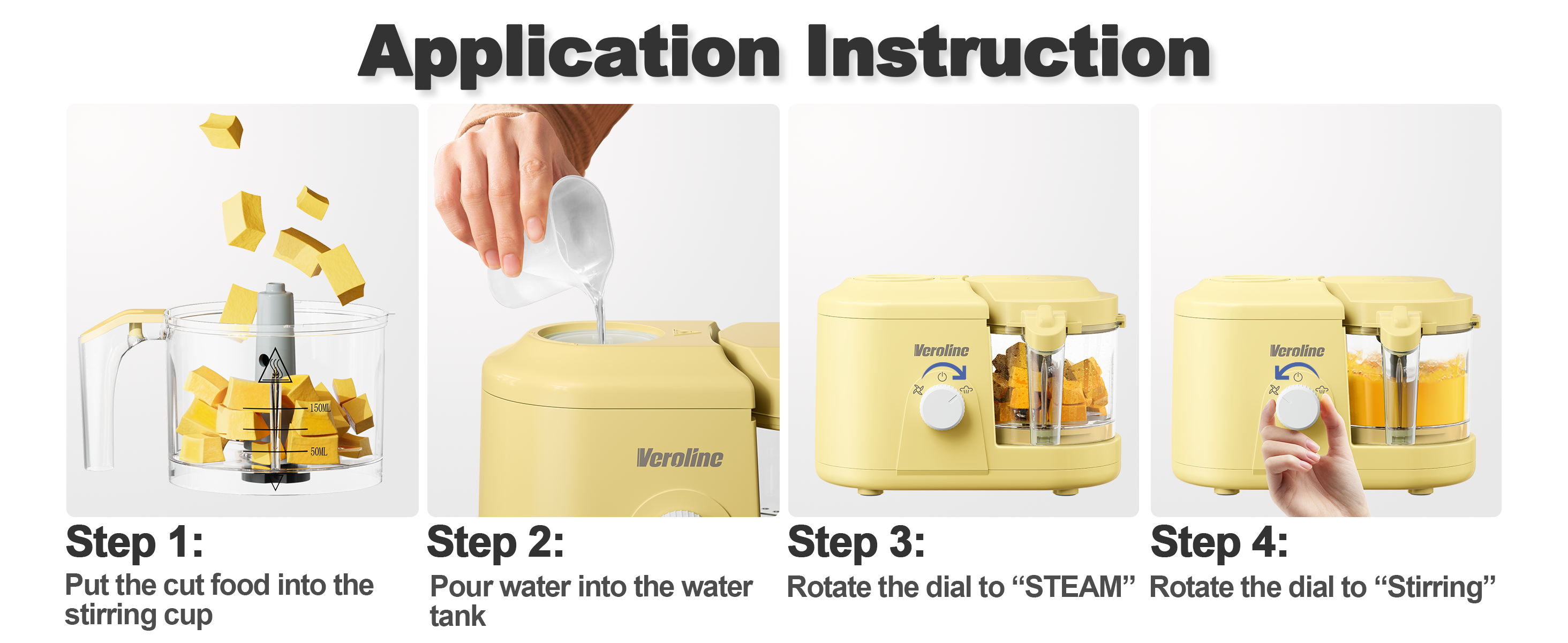【One Button Rotate Control】Only one button to rotate to choose different functions. Add water to the water tank and place the cut ingredients in the stirring cup, rotate to the right to select the "Steaming" icon and the machine will start steaming. Rotate to the left and select the "Stirring" icon. At this time, keep your hands still until the food is stirred to the desired state. (Please note that if the stirring cup is not assembled properly, the host cannot be turned on and operated.)