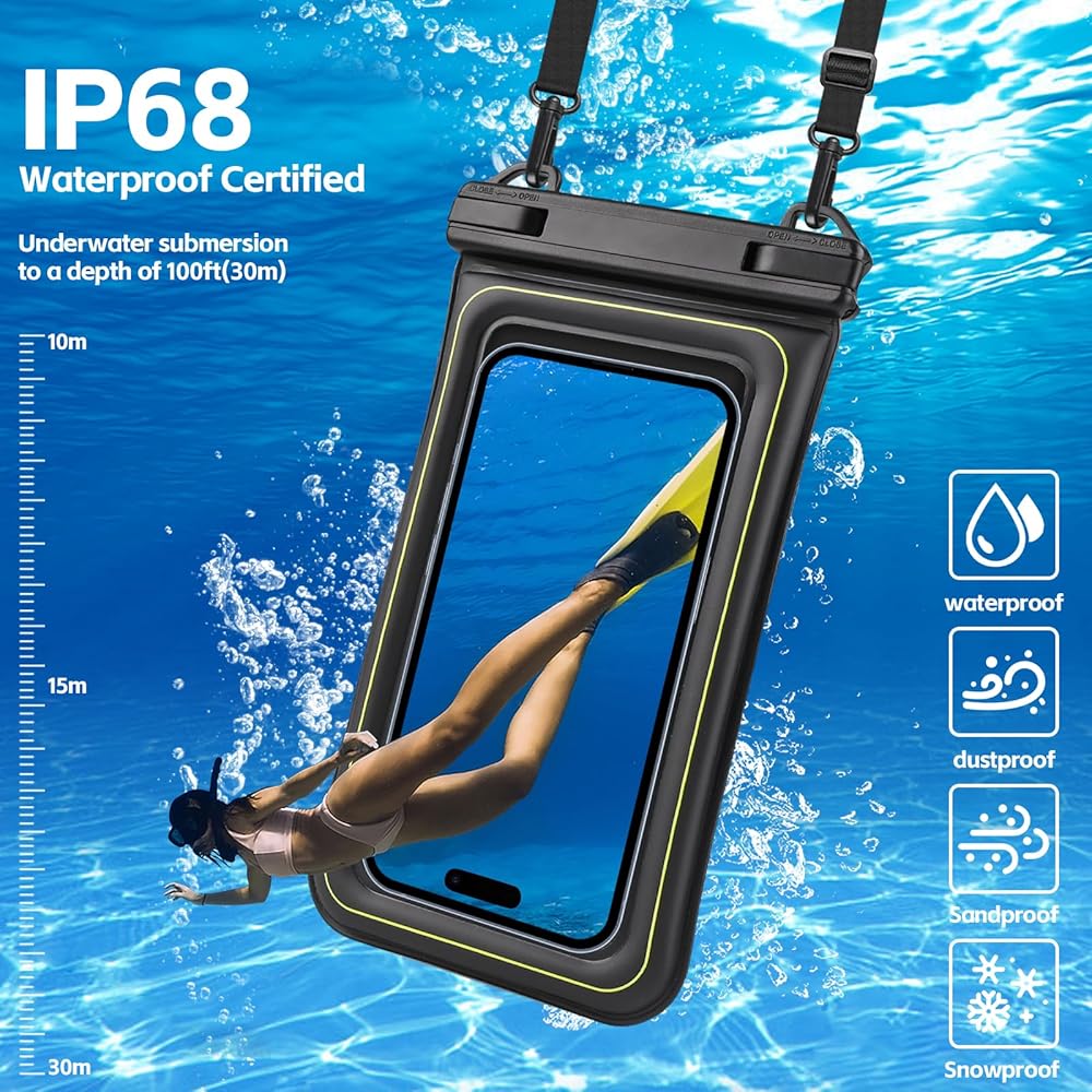 【IP68 Certified Waterproof Phone Pouch】Experience worry-free adventures with our 100% IP68 waterproof seal, phone case boasting providing protection in various environments, up to 30m deep. The easy snap and lock access ensures a perfect seal, defending against water, snow, dust, sand, and dirt. The design of our snap is easier to open than others. Perfect for beach, pool, fishing, swimming, boating, kayaking, snorkeling, or water park activities. (NOTE: Please test underwater before use)