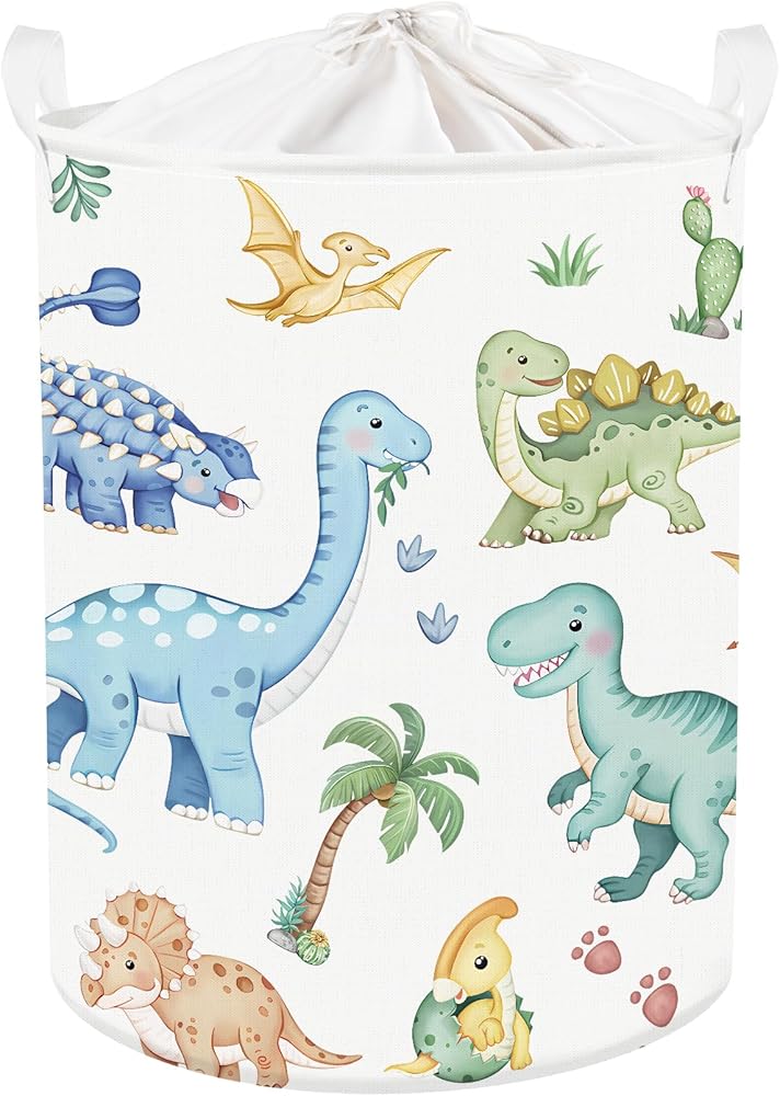 🦖 Boy Boho Dino Basket - Cute cartoon dinosaurs and unicorns are playing happily and guarding their own little ones together. It showcases friendly interactions between animals to children and motivates them to animals