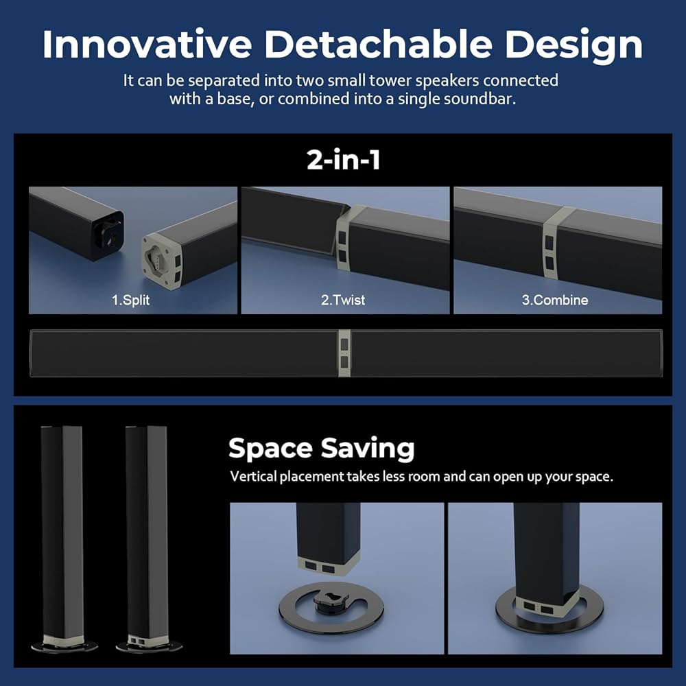 ✅Seamless Connectivity: Elevate your entertainment setup effortlessly with our TV speakers, crafted for hassle-free installation and compatibility. Immerse yourself in clear, captivating sound that breathes life into your favorite shows and movies. Benefit from high-quality, wired audio transfer with Optical and HDMI-ARC, while Bluetooth and AUX options cater to your wireless and traditional connection preferences.
