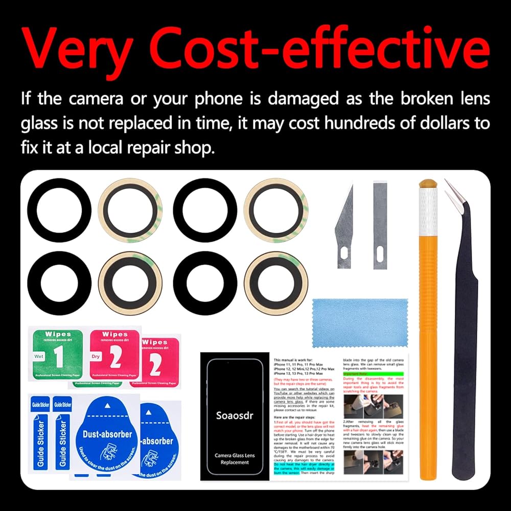 【2sets of camera lens glass and cost-effective】Get 2 sets for the price of 1 set. An extra lens repair kit is included for use in the event of an accident. If the camera or your phone is damaged as the broken lens glass is not replaced in time, it may cost hundreds of dollars to fix it at a local repair shop. If your phone does not work normally after repairing, you might have to buy a new one. About 10 dollars DIY VS a few hundreds dollars at a repair shop, which is more economical?