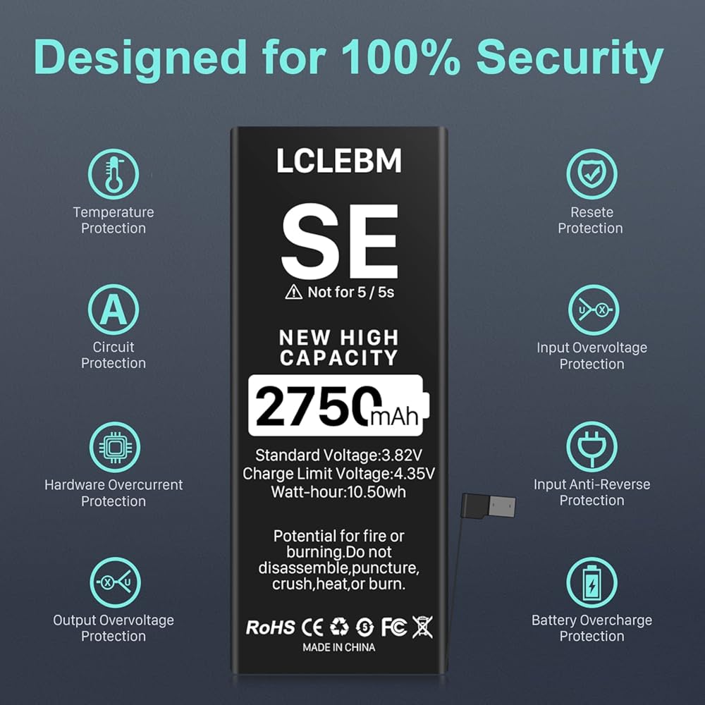 【CONDENSED INTO ESSENCE CAPACITY】With the high-tech integrated battery cells, LCLEBM battery for iPhone SE features a condensed into essence capacity - 2750 mAh while with the same size as the original, you will enjoy over 1000 charging cycles with efficient charging speed and a longer battery life just by replacing a new battery for your iPhone SE.