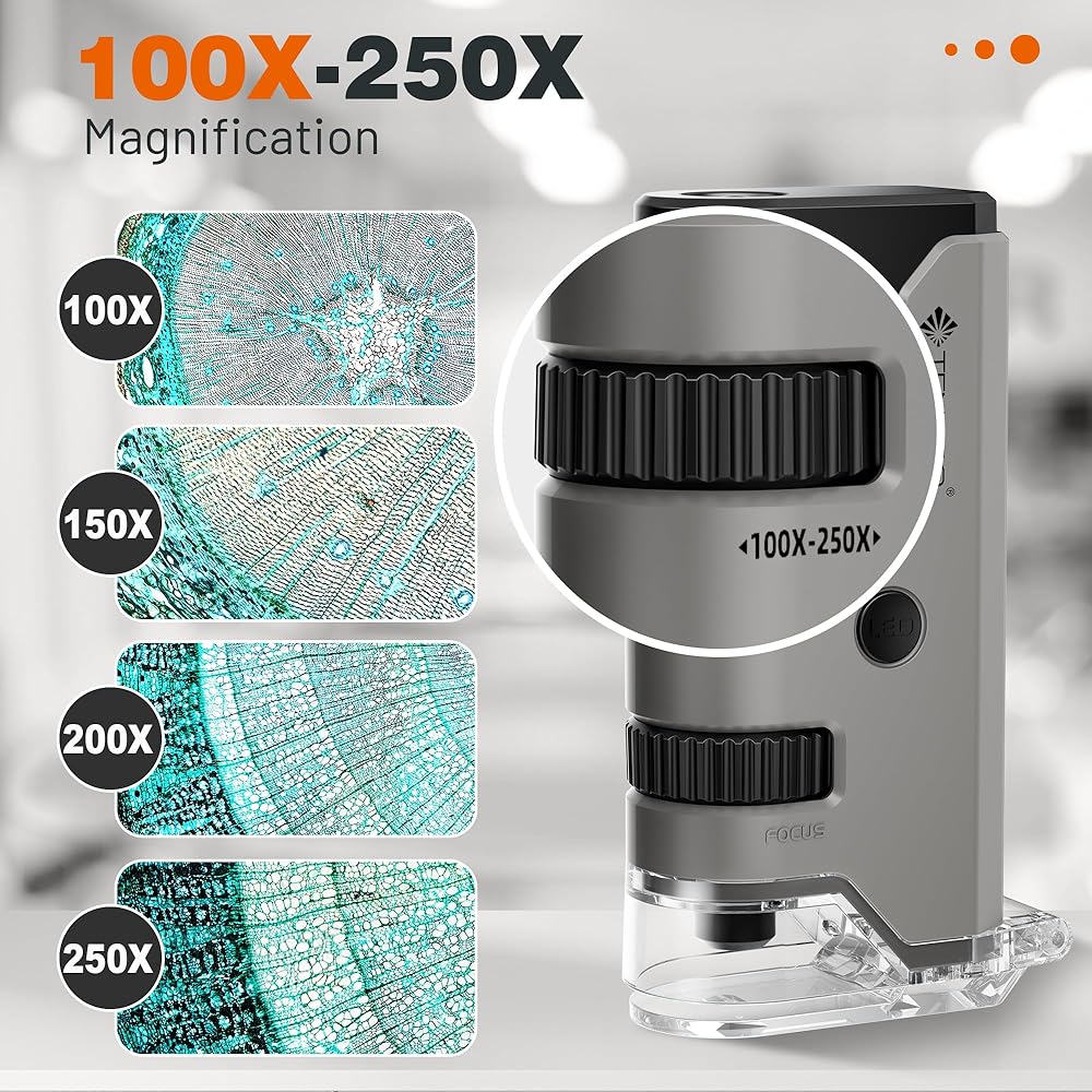 【High Magnification】The mini pocket microscope offers 100-250X magnification, you can clearly see more cell details, it meets various magnification observation needs of little scientists/kids/adults to explore the microscopic world.
