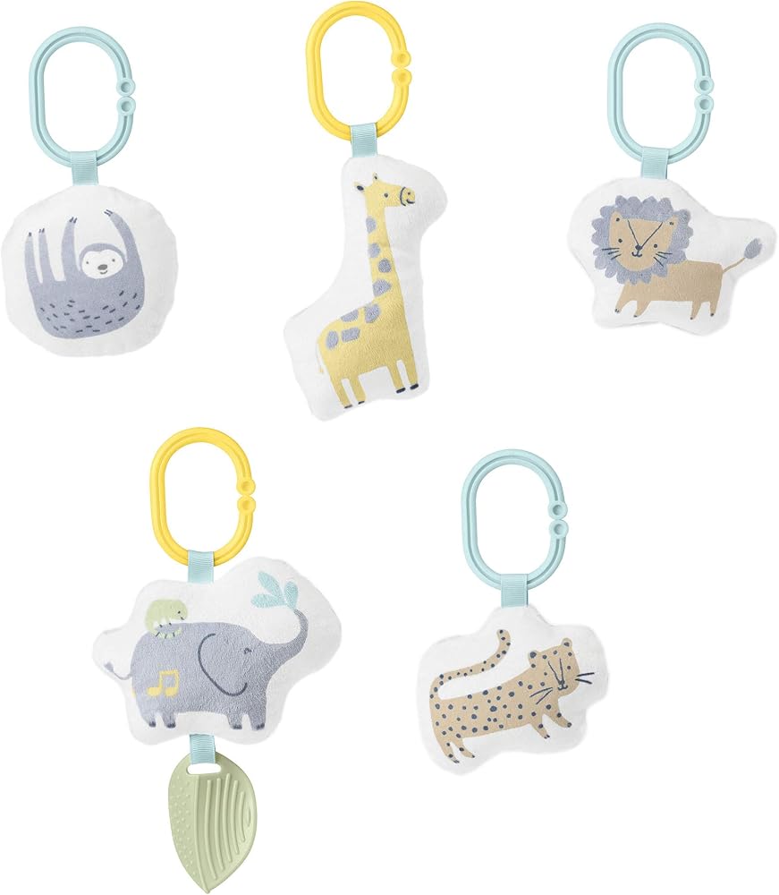 Five developmental toys include: Plush unicorn with rattle and popsicle teether toy, musical cupcake, ice cream with crinkle & waffle texture cone, soft tactile pretzel, lollipop with baby mirror