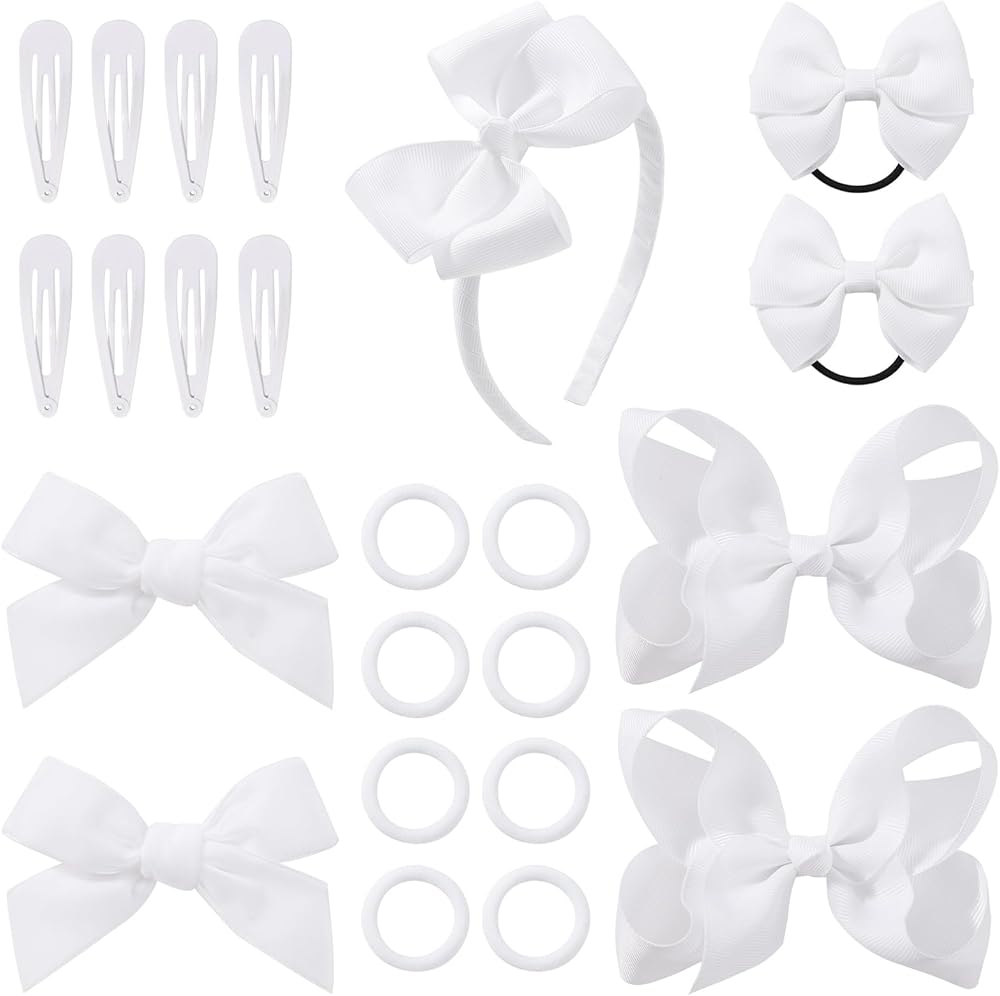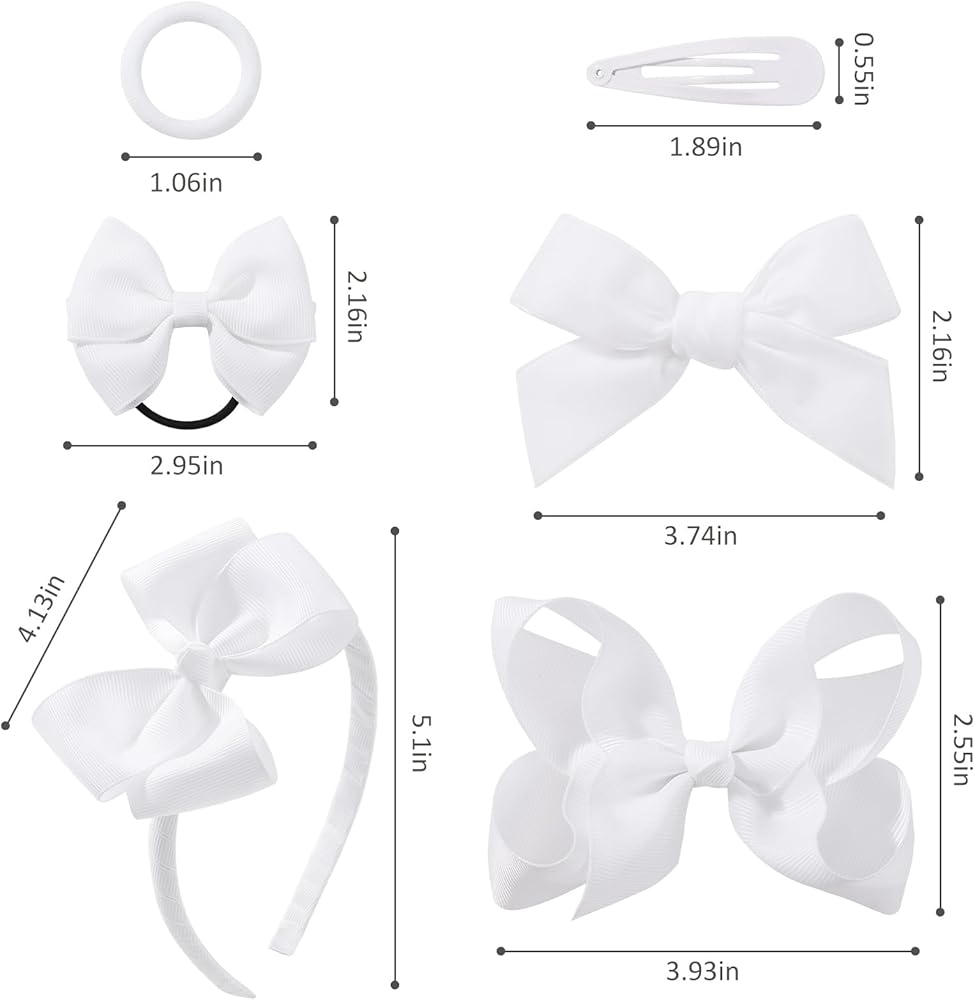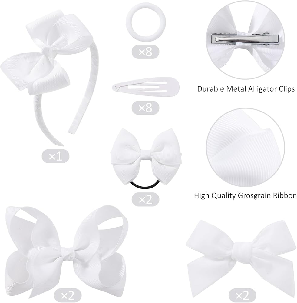 Hair Bows Package Includes💝 23PCS White Girls Bows. It includes 2 hair bows with alligator clips, 2 hair bows with elastic bands, 1 bow headband, 2 elegant velvet bows, 8 snap hair clips and 8 elastic hair ties. These girls' hair bows clips are absolutely adorable and well great for girls toddler hair decoration.