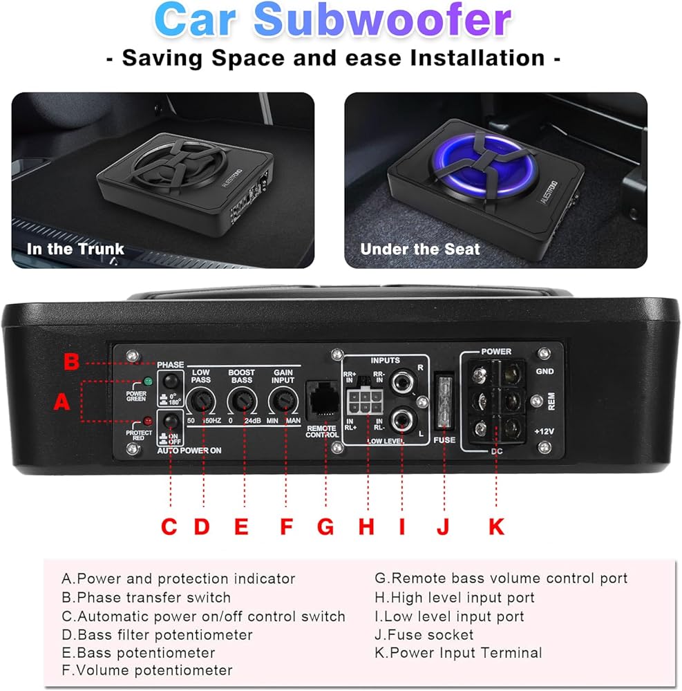 【Amp Features】: (1) Variable Low-Pass Filter, frequency 50Hz-250Hz; (2) Low-Level Inputs (RCA)- High Level Inputs, for options; (3) Variable Bass Boost & GAIN Input, adjust the low bass within the boost range to just the way you like it.