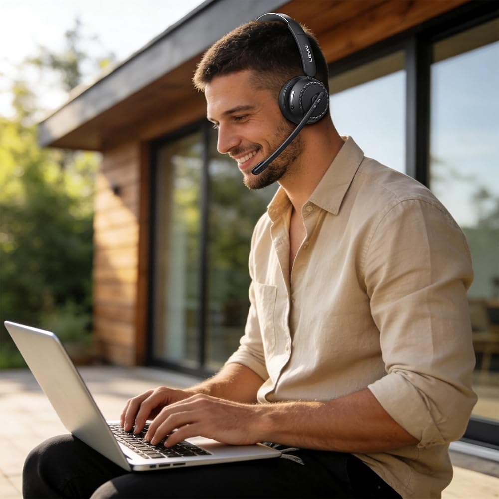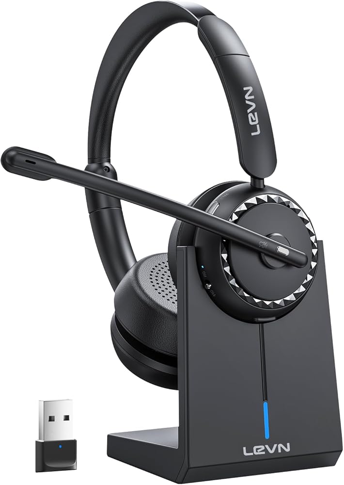 LEVN Wireless Headset, Wireless Headset with Mic for Work, AI Noise Cancelling, 65 Hrs Working Time, Bluetooth Headphones with Microphone from Computer/Call Center/Teams