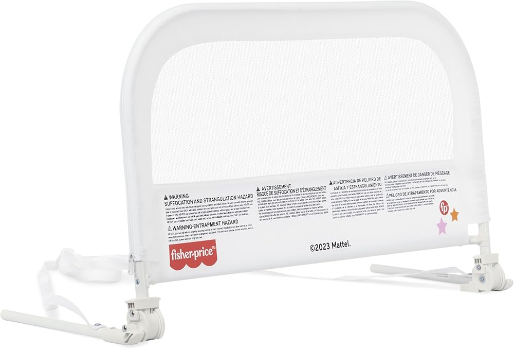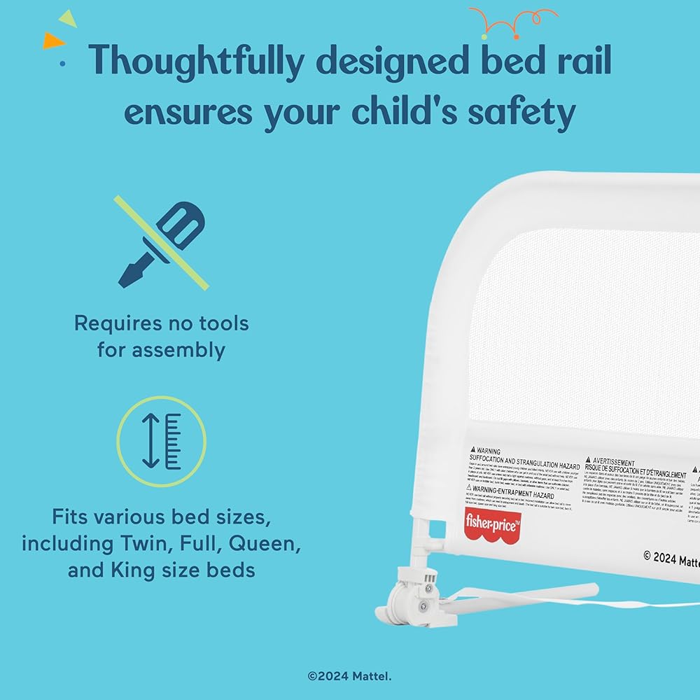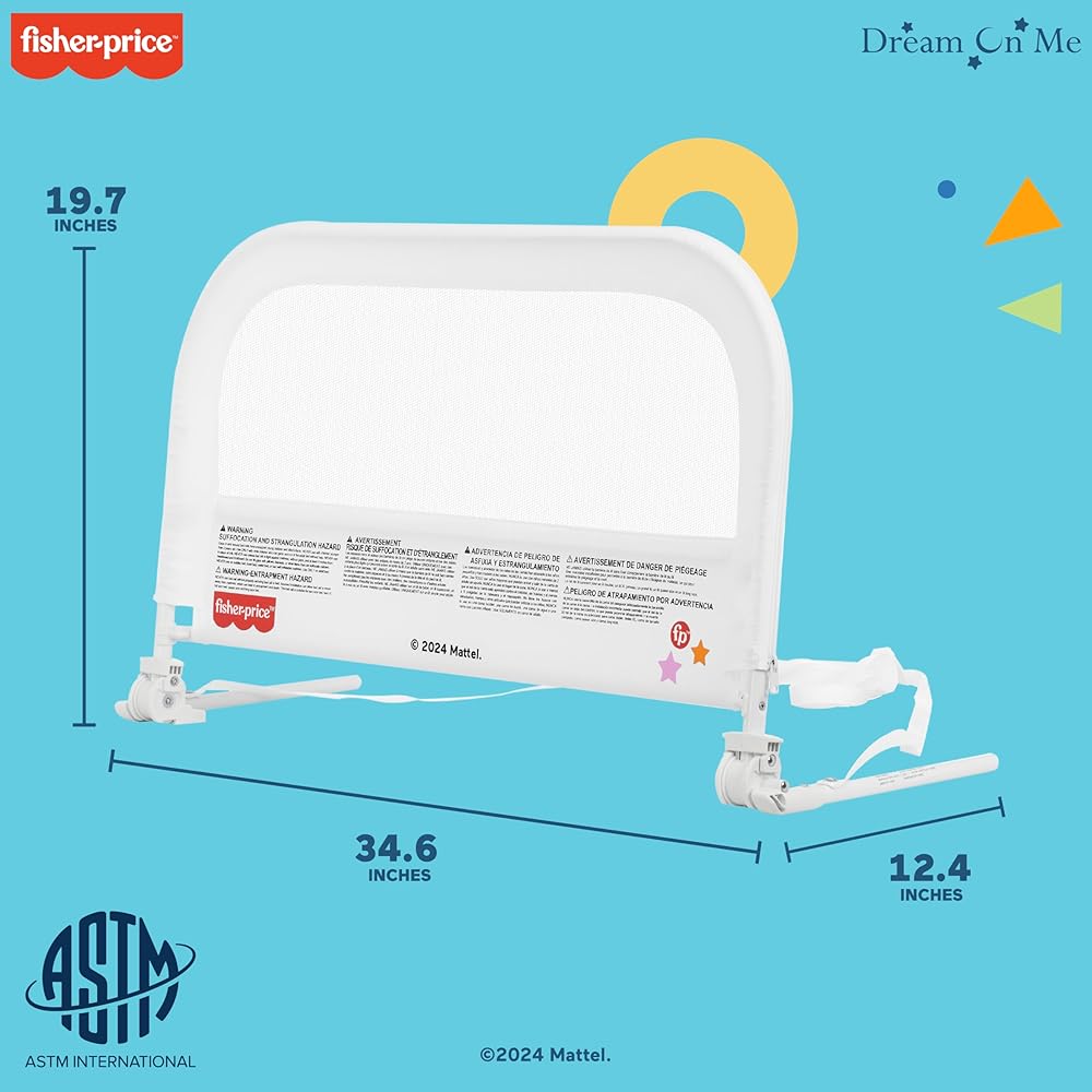 Ensure sweet dreams and a restful night's sleep for your little one with the Fisher-Price™ Little Naps Bed Rail by Dream On Me . This thoughtfully designed bed rail ensures your child's safety while adding a touch of convenience to your daily routine. Certified by the American Testing Society, it meets stringent safety standards, and the swing-down feature allows for easy access when getting in and out of bed or changing sheets. The Little Naps Bed Rail requires no tools for assembly and the adjustable anchoring strap securely fastens the bed rail to the bed, accommodating various bed sizes, including twin, full, queen, and king. Plus, caring for it is easy – simply wipe it down with a damp cloth. Product dimensions are 34.6” L x 12.4” W x 19.7” H. This product is suitable for both thin (4-5”) foam mattresses and thick (10-11”) spring mattresses, and is designed for children aged 2-5 years.