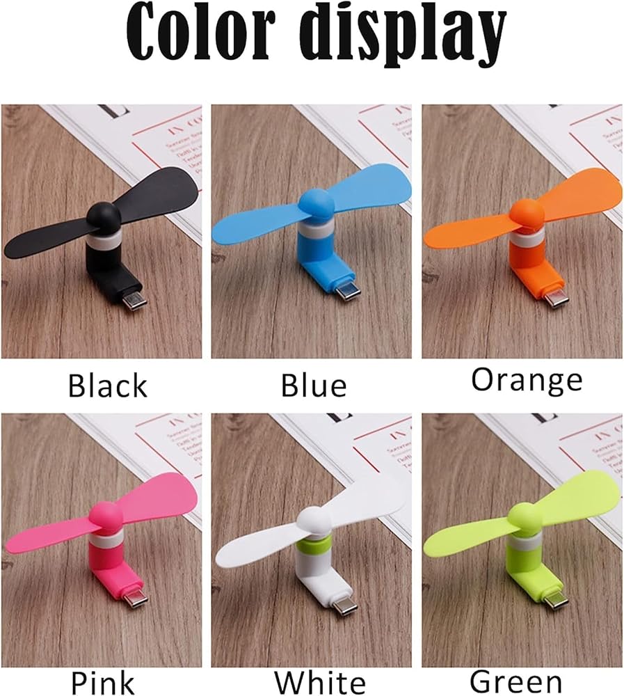 ❃ Package Includes - 3 Pack mini cell phone fan. Color: Black/White/Green. Material: The fan is made of materials of high quality TPE, which is environmental and safe. Power button free, simply plug in to turn on and unplug it to turn off.