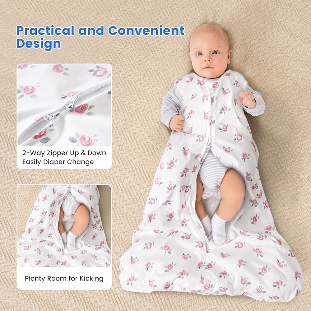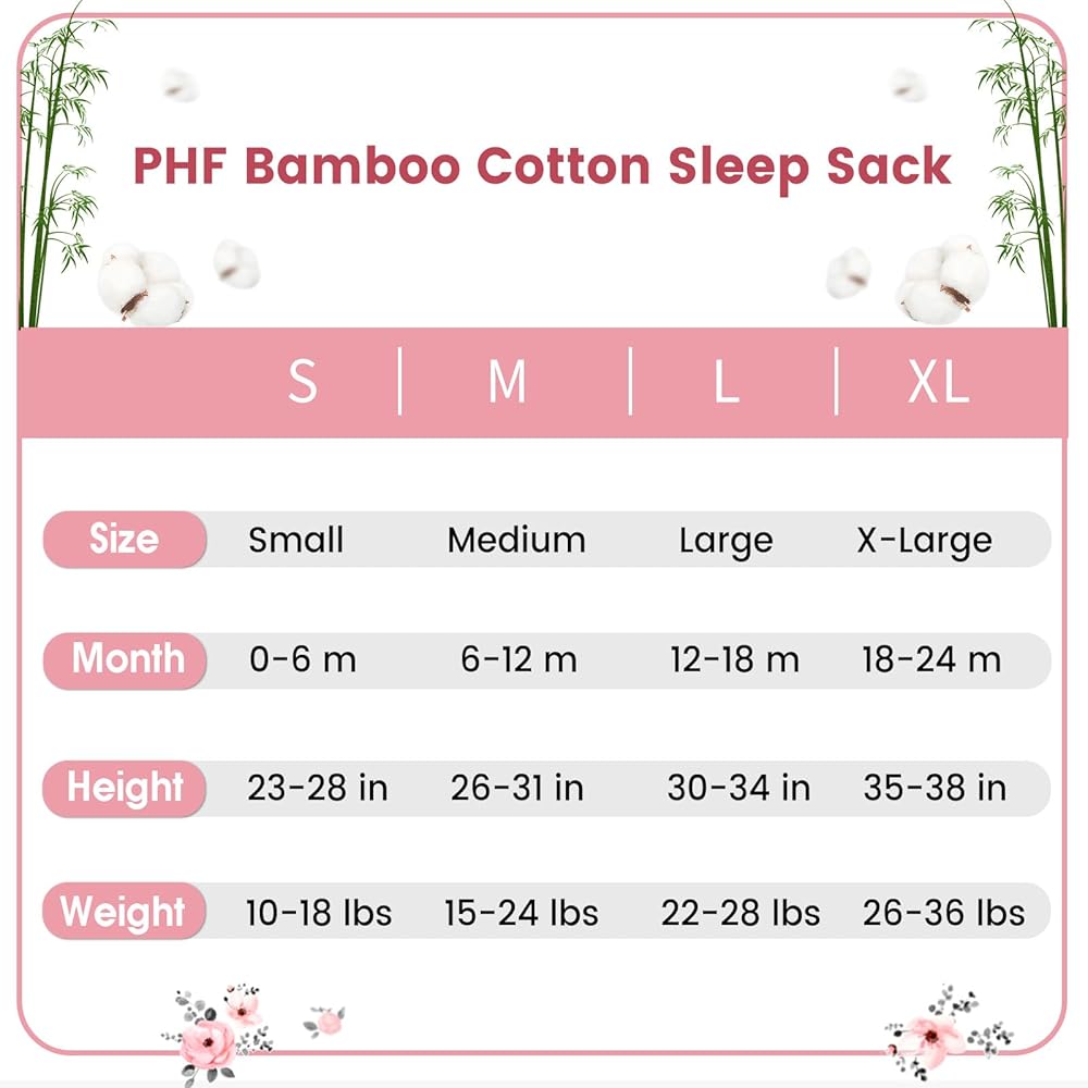 Breathable & Cooling: PHF baby sleep sacks are made of 70% rayon derived from bamboo and 30% cotton, compared to 100% cotton sleeping bags, this fabric is softer, more breathable and cooler, ensuring optimal comfort for your baby. The 0.5 TOG and rayon derived from bamboo especially fits in all seasons, especially in summer. Moreover, our sleeping bags are self-cooling to keep your sweet baby fresh and cozy all night long on hot summer days!